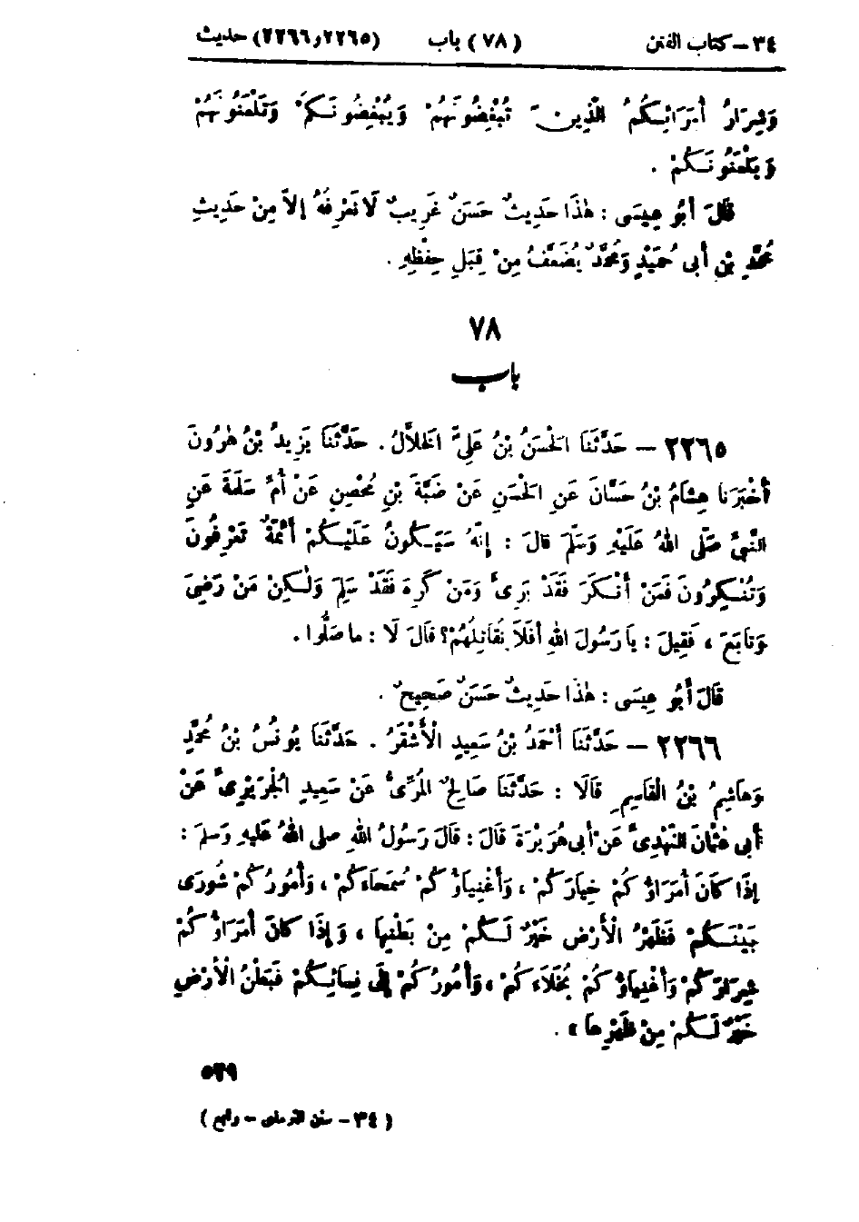 2265 - حَدَّثَنَا الحَسَنُ بْنُ عَلِيٍّ الخَلَّالُ قَالَ: حَدَّثَنَا يَزِيدُ بْنُ هَارُونَ قَالَ: أَخْبَرَنَا هِشَامُ بْنُ حَسَّانَ، عَنْ الحَسَنِ، عَنْ ضَبَّةَ بْنِ مِحْصَنٍ، عَنْ أُمِّ سَلَمَةَ، عَنِ النَّبِيِّ صَلَّى اللَّهُ عَلَيْهِ وَسَلَّمَ، قَالَ: «إِنَّهُ §سَيَكُونُ عَلَيْكُمْ أَئِمَّةٌ تَعْرِفُونَ وَتُنْكِرُونَ فَمَنْ أَنْكَرَ فَقَدْ بَرِئَ وَمَنْ كَرِهَ فَقَدْ سَلِمَ وَلَكِنْ مَنْ رَضِيَ وَتَابَعَ»، فَقِيلَ: يَا رَسُولَ اللَّهِ أَفَلَا نُقَاتِلُهُمْ؟ قَالَ: «لَا، مَا صَلَّوْا»: «هَذَا حَدِيثٌ حَسَنٌ صَحِيحٌ»
