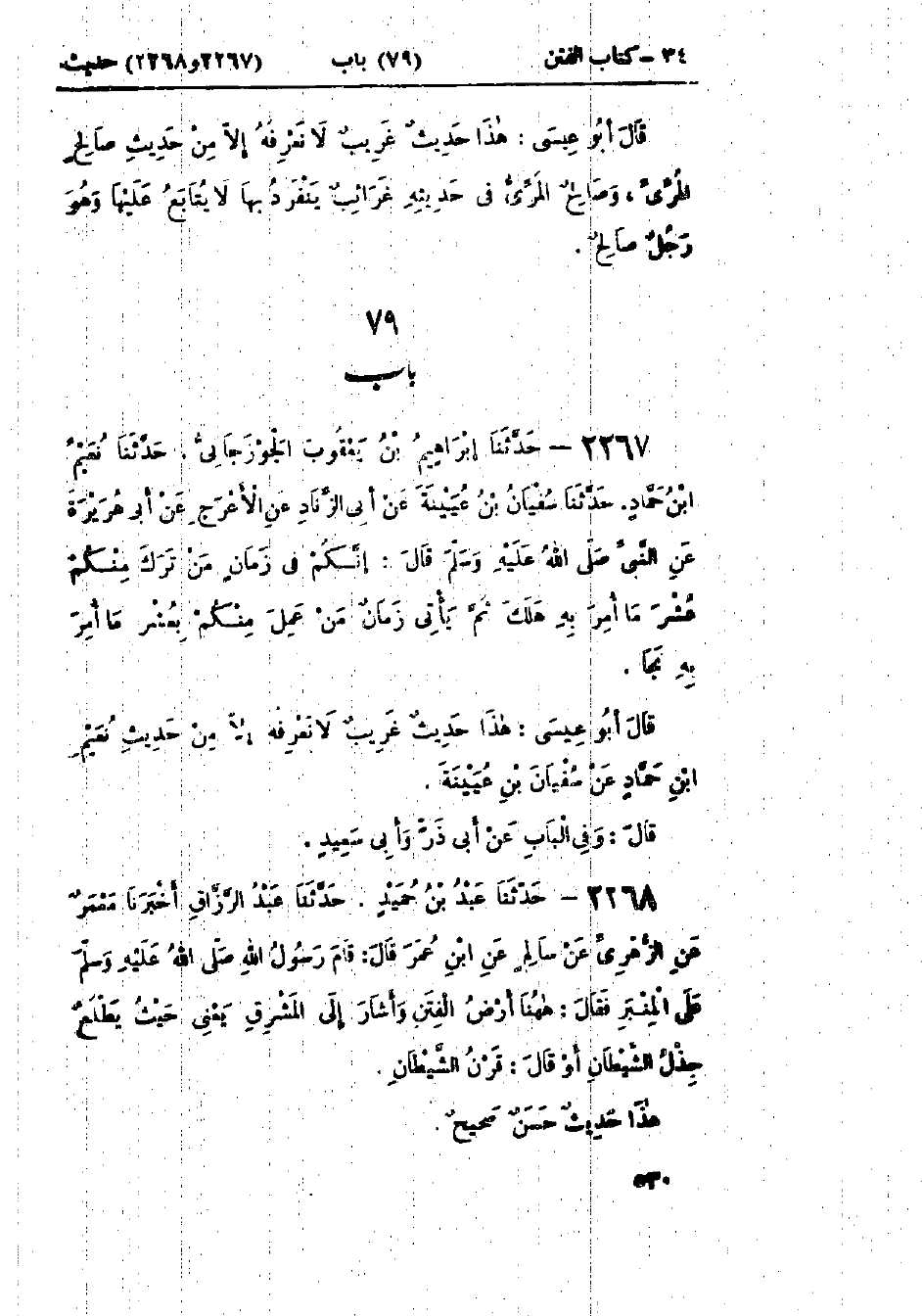2268 - حَدَّثَنَا عَبْدُ بْنُ حُمَيْدٍ قَالَ: حَدَّثَنَا عَبْدُ الرَّزَّاقِ قَالَ: أَخْبَرَنَا مَعْمَرٌ، عَنْ الزُّهْرِيِّ، عَنْ سَالِمٍ، عَنْ ابْنِ عُمَرَ، قَالَ: قَامَ رَسُولُ اللَّهِ صَلَّى اللَّهُ عَلَيْهِ وَسَلَّمَ عَلَى المِنْبَرِ فَقَالَ: «§هَاهُنَا أَرْضُ الْفِتَنِ»، وَأَشَارَ إِلَى المَشْرِقِ، يَعْنِي حَيْثُ يَطْلُعُ قَرْنُ الشَّيْطَانِ، أَوْ قَالَ: قَرْنُ الشَّمْسِ هَذَا حَدِيثٌ حَسَنٌ صَحِيحٌ