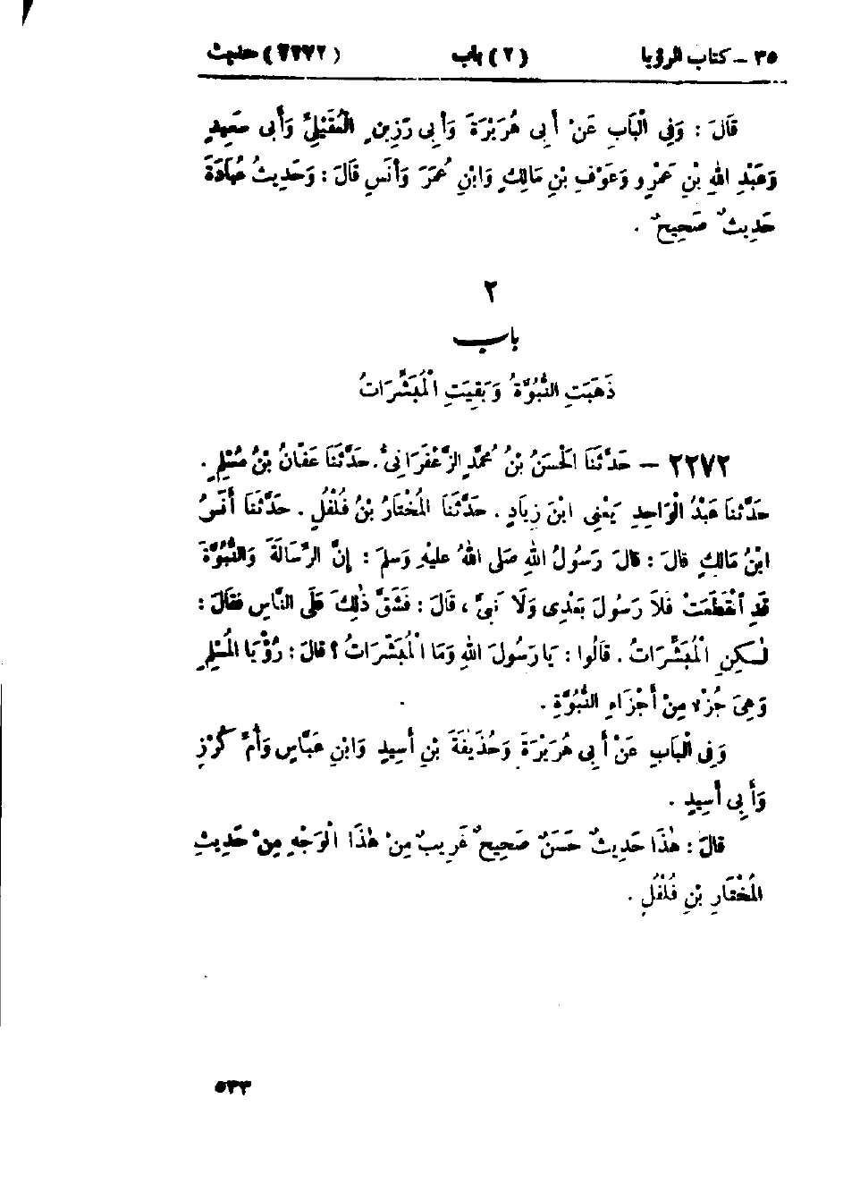 2272 - حَدَّثَنَا الحَسَنُ بْنُ مُحَمَّدٍ الزَّعْفَرَانِيُّ قَالَ: حَدَّثَنَا عَفَّانُ بْنُ مُسْلِمٍ قَالَ: حَدَّثَنَا عَبْدُ الْوَاحِدِ بْنُ زِيَادٍ قَالَ: حَدَّثَنَا المُخْتَارُ بْنُ فُلْفُلٍ قَالَ: حَدَّثَنَا أَنَسُ بْنُ مَالِكٍ، قَالَ: قَالَ رَسُولُ اللَّهِ صَلَّى اللَّهُ عَلَيْهِ وَسَلَّمَ: «إِنَّ §الرِّسَالَةَ وَالنُّبُوَّةَ قَدْ انْقَطَعَتْ فَلَا رَسُولَ بَعْدِي وَلَا نَبِيَّ»، قَالَ: فَشَقَّ ذَلِكَ عَلَى النَّاسِ فَقَالَ: «لَكِنِ المُبَشِّرَاتُ». قَالُوا: يَا رَسُولَ اللَّهِ وَمَا المُبَشِّرَاتُ؟ قَالَ: «رُؤْيَا المُسْلِمِ، وَهِيَ جُزْءٌ مِنْ أَجْزَاءِ النُّبُوَّةِ» وَفِي البَابِ عَنْ أَبِي هُرَيْرَةَ، وَحُذَيْفَةَ بْنِ أَسِيدٍ، وَابْنِ عَبَّاسٍ، وَأُمِّ كُرْزٍ «هَذَا حَدِيثٌ صَحِيحٌ غَرِيبٌ مِنْ هَذَا الوَجْهِ مِنْ حَدِيثِ المُخْتَارِ بْنِ فُلْفُلٍ»