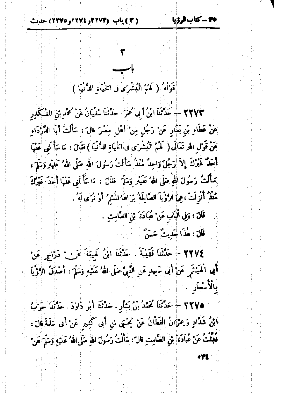 2273 - حَدَّثَنَا ابْنُ أَبِي عُمَرَ قَالَ: حَدَّثَنَا سُفْيَانُ، عَنْ مُحَمَّدِ بْنِ المُنْكَدِرِ، عَنْ عَطَاءِ بْنِ يَسَارٍ، عَنْ رَجُلٍ، مِنْ أَهْلِ مِصْرَ، قَالَ: سَأَلْتُ أَبَا الدَّرْدَاءِ، عَنْ قَوْلِ اللَّهِ تَعَالَى {لَهُمُ البُشْرَى فِي الحَيَاةِ الدُّنْيَا} [يونس: 64] فَقَالَ: مَا سَأَلَنِي عَنْهَا أَحَدٌ غَيْرُكَ إِلَّا رَجُلٌ وَاحِدٌ مُنْذُ سَأَلْتُ رَسُولَ اللَّهِ صَلَّى اللَّهُ عَلَيْهِ وَسَلَّمَ فَقَالَ: «مَا سَأَلَنِي عَنْهَا أَحَدٌ غَيْرُكَ مُنْذُ أُنْزِلَتْ، §هِيَ الرُّؤْيَا الصَّالِحَةُ يَرَاهَا المُسْلِمُ أَوْ تُرَى لَهُ» وَفِي البَاب عَنْ عُبَادَةَ بْنِ الصَّامِتِ «هَذَا حَدِيثٌ حَسَنٌ»