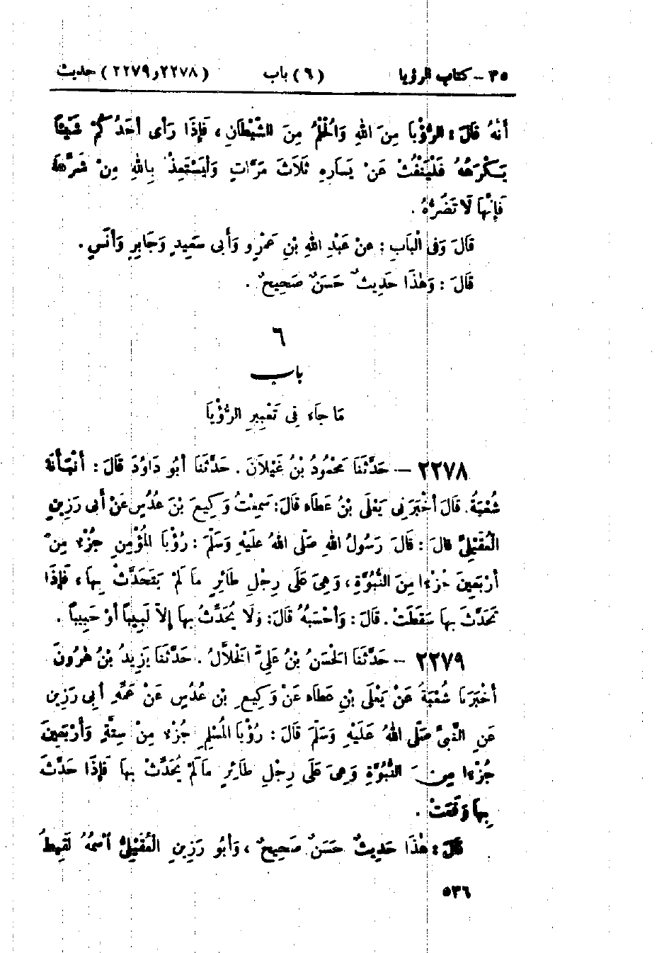 2279 - حَدَّثَنَا الحَسَنُ بْنُ عَلِيٍّ الخَلَّالُ قَالَ: حَدَّثَنَا يَزِيدُ بْنُ هَارُونَ قَالَ: أَخْبَرَنَا شُعْبَةُ، عَنْ يَعْلَى بْنِ عَطَاءٍ، عَنْ وَكِيعِ بْنِ عُدُسٍ، عَنْ عَمِّهِ أَبِي رَزِينٍ، عَنِ النَّبِيِّ صَلَّى اللَّهُ عَلَيْهِ وَسَلَّمَ قَالَ: «§رُؤْيَا المُسْلِمِ جُزْءٌ مِنْ سِتَّةٍ وَأَرْبَعِينَ جُزْءًا مِنَ النُّبُوَّةِ وَهِيَ عَلَى رِجْلِ طَائِرٍ مَا لَمْ يُحَدِّثْ بِهَا فَإِذَا حَدَّثَ بِهَا وَقَعَتْ». " هَذَا حَدِيثٌ حَسَنٌ صَحِيحٌ وَأَبُو رَزِينٍ العُقَيْلِيُّ اسْمُهُ: لَقِيطُ -[537]- بْنُ عَامِرٍ " وَرَوَى حَمَّادُ بْنُ سَلَمَةَ، عَنْ يَعْلَى بْنِ عَطَاءٍ، فَقَالَ: عَنْ وَكِيعِ بْنِ حُدُسٍ، وَقَالَ شُعْبَةُ، وَأَبُو عَوَانَةَ، وَهُشَيْمٌ: عَنْ يَعْلَى بْنِ عَطَاءٍ، عَنْ وَكِيعِ بْنِ عُدُسٍ، وَهَذَا أَصَحُّ