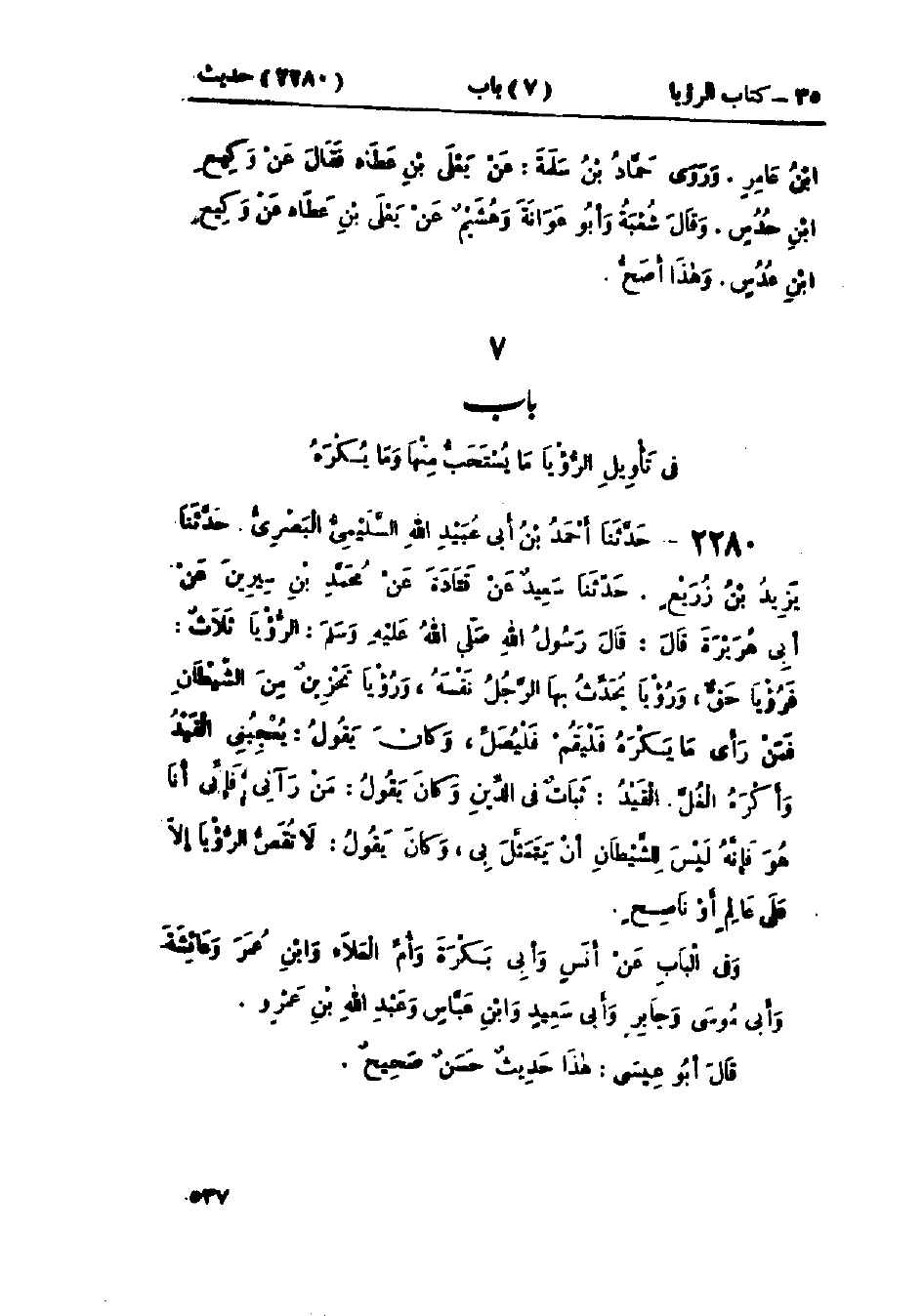 وَكَانَ يَقُولُ: «§لَا تُقَصُّ الرُّؤْيَا إِلَّا عَلَى عَالِمٍ أَوْ نَاصِحٍ» وَفِي البَاب عَنْ أَنَسٍ، وَأَبِي بَكْرَةَ، وَأُمِّ العَلَاءِ، وَابْنِ عُمَرَ، وَعَائِشَةَ، وَأَبِي مُوسَى، وَجَابِرٍ، وَأَبِي سَعِيدٍ، وَابْنِ عَبَّاسٍ، وَعَبْدِ اللَّهِ بْنِ عَمْرٍو: «هَذَا حَدِيثٌ حَسَنٌ صَحِيحٌ»