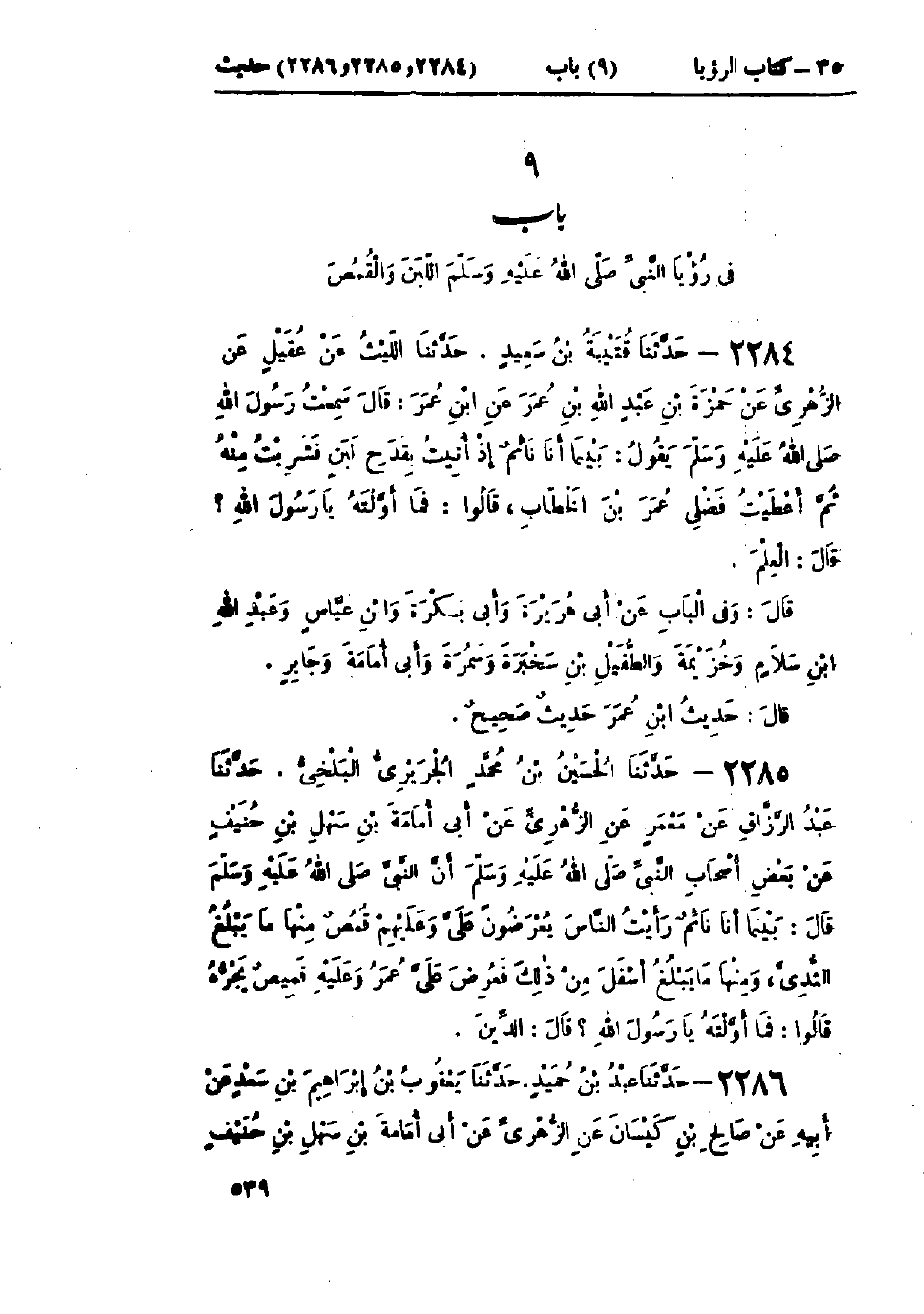 2284 - حَدَّثَنَا قُتَيْبَةُ بْنُ سَعِيدٍ قَالَ: حَدَّثَنَا اللَّيْثُ، عَنْ عُقَيْلٍ، عَنْ الزُّهْرِيِّ، عَنْ حَمْزَةَ بْنِ عَبْدِ اللَّهِ بْنِ عُمَرَ، عَنْ ابْنِ عُمَرَ، قَالَ: سَمِعْتُ رَسُولَ اللَّهِ صَلَّى اللَّهُ عَلَيْهِ وَسَلَّمَ يَقُولُ: «§بَيْنَا أَنَا نَائِمٌ إِذْ أُتِيتُ بِقَدَحِ لَبَنٍ فَشَرِبْتُ مِنْهُ، ثُمَّ أَعْطَيْتُ فَضْلِي عُمَرَ بْنَ الخَطَّابِ»، قَالُوا: فَمَا أَوَّلْتَهُ يَا رَسُولَ اللَّهِ؟ قَالَ: «العِلْمَ». وَفِي البَاب عَنْ أَبِي هُرَيْرَةَ، وَأَبِي بَكْرَةَ، وَابْنِ عَبَّاسٍ، وَعَبْدِ اللَّهِ بْنِ سَلَامٍ، وَخُزَيْمَةَ، وَالطُّفَيْلِ بْنِ سَخْبَرَةَ، وَسَمُرَةَ، وَأَبِي أُمَامَةَ، وَجَابِرٍ. حَدِيثُ ابْنِ عُمَرَ حَدِيثٌ صَحِيحٌ
