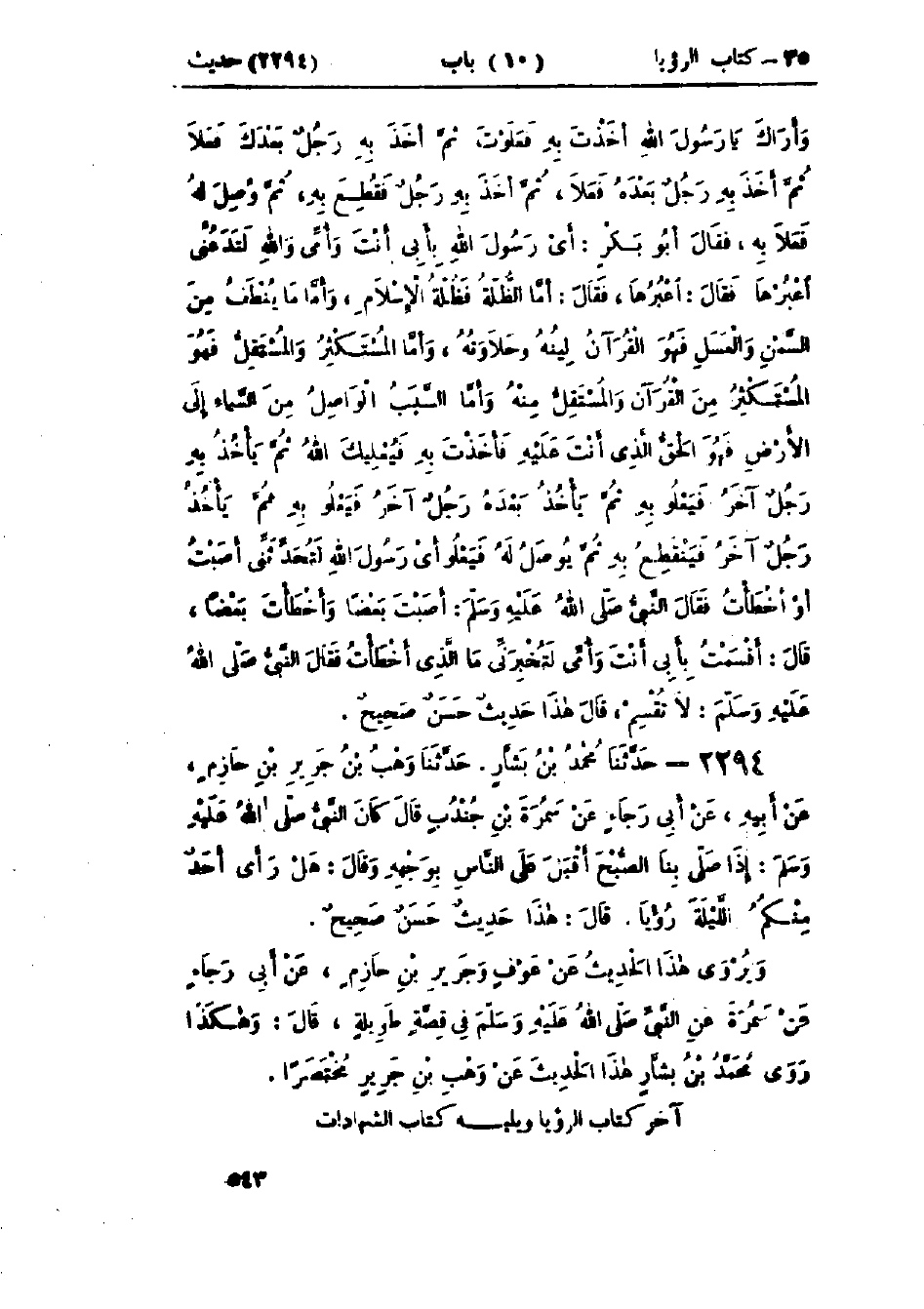 2294 - حَدَّثَنَا مُحَمَّدُ بْنُ بَشَّارٍ قَالَ: حَدَّثَنَا وَهْبُ بْنُ جَرِيرِ بْنِ حَازِمٍ، عَنْ أَبِيهِ، عَنْ أَبِي رَجَاءٍ، عَنْ سَمُرَةَ بْنِ جُنْدَبٍ، قَالَ: كَانَ النَّبِيُّ صَلَّى اللَّهُ عَلَيْهِ وَسَلَّمَ إِذَا صَلَّى بِنَا الصُّبْحَ أَقْبَلَ عَلَى النَّاسِ بِوَجْهِهِ وَقَالَ: «§هَلْ رَأَى أَحَدٌ مِنْكُمُ اللَّيْلَةَ رُؤْيَا». «هَذَا حَدِيثٌ حَسَنٌ صَحِيحٌ وَيُرْوَى هَذَا الحَدِيثُ عَنْ عَوْفٍ، وَجَرِيرِ بْنِ حَازِمٍ، عَنْ أَبِي رَجَاءٍ، عَنْ سَمُرَةَ، عَنِ النَّبِيِّ صَلَّى اللَّهُ عَلَيْهِ وَسَلَّمَ فِي قِصَّةٍ طَوِيلَةٍ،» وَهَكَذَا رَوَى لَنَا مُحَمَّدُ بْنُ بَشَّارٍ، هَذَا الحَدِيثَ عَنْ وَهْبِ بْنِ جَرِيرٍ، مُخْتَصَرًا "