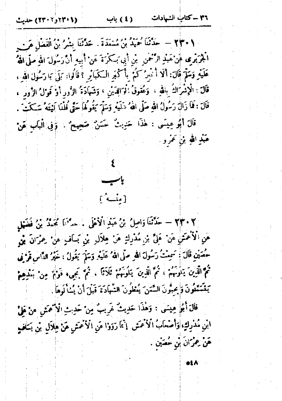 2301 - حَدَّثَنَا حُمَيْدُ بْنُ مَسْعَدَةَ قَالَ: حَدَّثَنَا بِشْرُ بْنُ المُفَضَّلِ، عَنْ الجُرَيْرِيِّ، عَنْ عَبْدِ الرَّحْمَنِ بْنِ أَبِي بَكْرَةَ، عَنْ أَبِيهِ، أَنَّ رَسُولَ اللَّهِ صَلَّى اللَّهُ عَلَيْهِ وَسَلَّمَ قَالَ: «§أَلَا أُخْبِرُكُمْ بِأَكْبَرِ الكَبَائِرِ»؟ قَالُوا: بَلَى يَا رَسُولَ اللَّهِ، قَالَ: «الإِشْرَاكُ بِاللَّهِ، وَعُقُوقُ الوَالِدَيْنِ، وَشَهَادَةُ الزُّورِ أَوْ قَوْلُ الزُّورِ» قَالَ: «فَمَا زَالَ رَسُولُ اللَّهِ صَلَّى اللَّهُ عَلَيْهِ وَسَلَّمَ يَقُولُهَا حَتَّى قُلْنَا لَيْتَهُ سَكَتَ»: «هَذَا حَدِيثٌ حَسَنٌ صَحِيحٌ» وَفِي البَاب عَنْ عَبْدِ اللَّهِ بْنِ عَمْرٍو