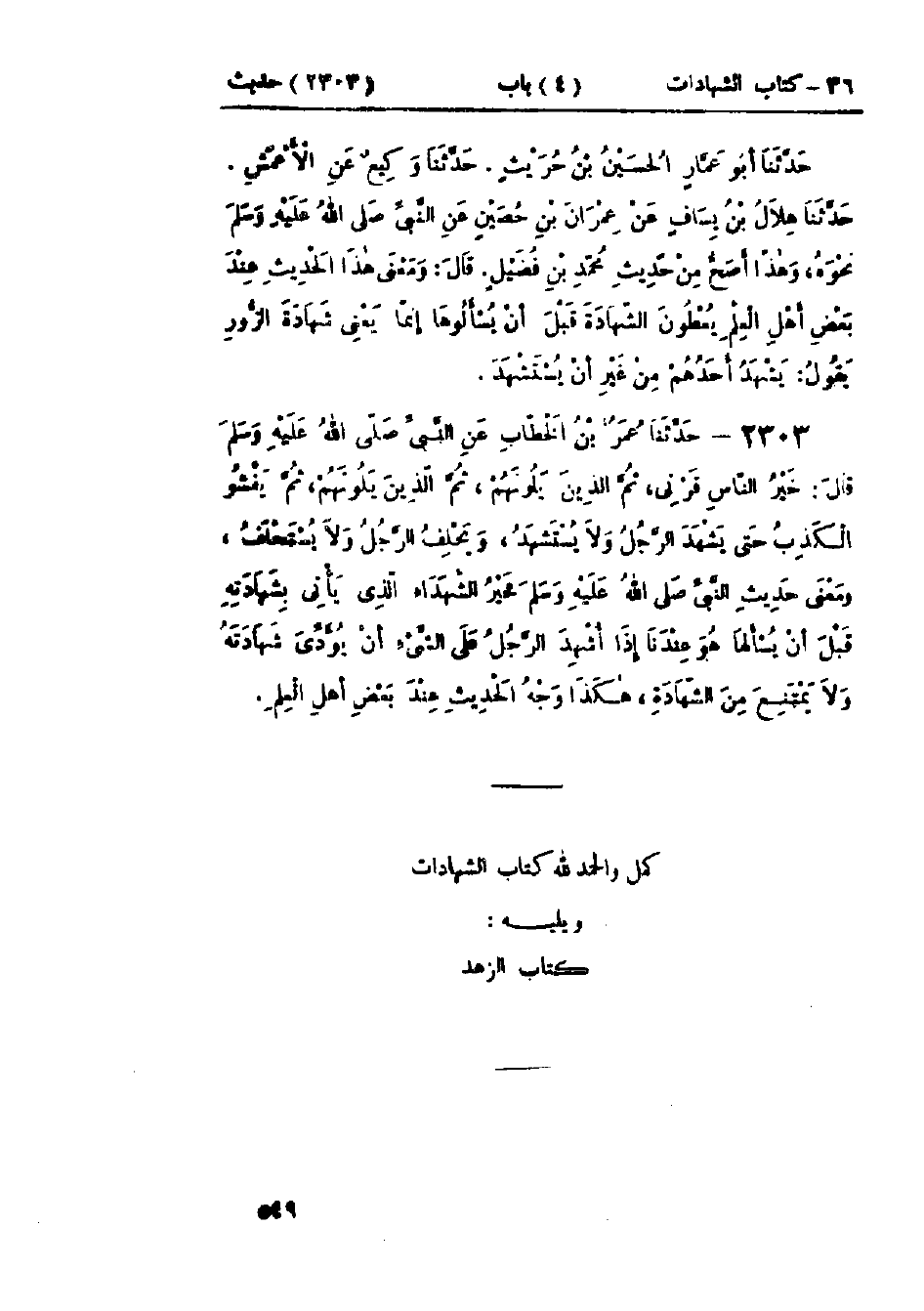 2303 - حَدِيثِ عُمَرَ بْنِ الخَطَّابِ، عَنِ النَّبِيِّ صَلَّى اللَّهُ عَلَيْهِ وَسَلَّمَ قَالَ: «§خَيْرُ النَّاسِ قَرْنِي، ثُمَّ الَّذِينَ يَلُونَهُمْ، ثُمَّ الَّذِينَ يَلُونَهُمْ، ثُمَّ يَفْشُو الكَذِبُ حَتَّى يَشْهَدَ الرَّجُلُ وَلَا يُسْتَشْهَدُ، وَيَحْلِفَ الرَّجُلُ وَلَا يُسْتَحْلَفُ» وَمَعْنَى حَدِيثِ النَّبِيِّ صَلَّى اللَّهُ عَلَيْهِ وَسَلَّمَ: خَيْرُ الشُّهَدَاءِ الَّذِي يَأْتِي بِشَهَادَتِهِ قَبْلَ أَنْ يُسْأَلَهَا، هُوَ عِنْدَنَا إِذَا أُشْهِدَ الرَّجُلُ عَلَى الشَّيْءِ أَنْ يُؤَدِّيَ شَهَادَتَهُ وَلَا يَمْتَنِعَ مِنَ الشَّهَادَةِ، هَكَذَا وَجْهُ الحَدِيثِ عِنْدَ بَعْضِ أَهْلِ العِلْمِ "