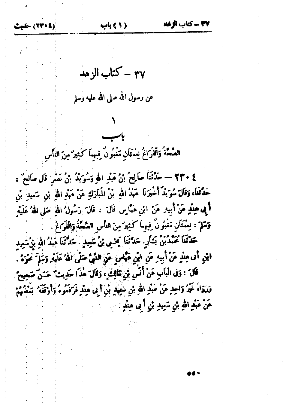 2304 - حَدَّثَنَا صَالِحُ بْنُ عَبْدِ اللَّهِ، وَسُوَيْدُ بْنُ نَصْرٍ، قَالَ صَالِحٌ: حَدَّثَنَا، وَقَالَ سُوَيْدٌ: أَخْبَرَنَا عَبْدُ اللَّهِ بْنُ المُبَارَكِ، عَنْ عَبْدِ اللَّهِ بْنِ سَعِيدِ بْنِ أَبِي هِنْدٍ، عَنْ أَبِيهِ، عَنْ ابْنِ عَبَّاسٍ، قَالَ: قَالَ رَسُولُ اللَّهِ صَلَّى اللَّهُ عَلَيْهِ وَسَلَّمَ: «§نِعْمَتَانِ مَغْبُونٌ فِيهِمَا كَثِيرٌ مِنَ النَّاسِ الصِّحَّةُ وَالفَرَاغُ» حَدَّثَنَا مُحَمَّدُ بْنُ بَشَّارٍ قَالَ: حَدَّثَنَا يَحْيَى بْنُ سَعِيدٍ قَالَ: حَدَّثَنَا عَبْدُ اللَّهِ بْنُ سَعِيدِ بْنِ أَبِي هِنْدٍ، عَنْ أَبِيهِ، عَنْ ابْنِ عَبَّاسٍ، عَنِ النَّبِيِّ صَلَّى اللَّهُ عَلَيْهِ وَسَلَّمَ نَحْوَهُ، وَفِي البَاب عَنْ أَنَسِ بْنِ مَالِكٍ. «هَذَا حَدِيثٌ حَسَنٌ صَحِيحٌ، وَرَوَاهُ غَيْرُ وَاحِدٍ عَنْ عَبْدِ اللَّهِ بْنِ سَعِيدِ بْنِ أَبِي هِنْدٍ، فَرَفَعُوهُ، وَأَوْقَفَهُ بَعْضُهُمْ عَنْ عَبْدِ اللَّهِ بْنِ سَعِيدِ بْنِ أَبِي هِنْدٍ»