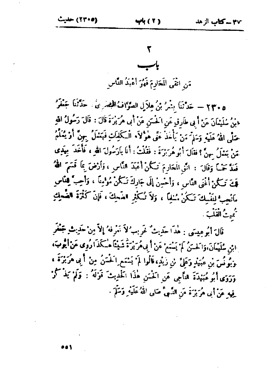 2305 - حَدَّثَنَا بِشْرُ بْنُ هِلَالٍ الصَّوَّافُ البَصْرِيُّ قَالَ: حَدَّثَنَا جَعْفَرُ بْنُ سُلَيْمَانَ، عَنْ أَبِي طَارِقٍ، عَنْ الحَسَنِ، عَنْ أَبِي هُرَيْرَةَ، قَالَ: قَالَ رَسُولُ اللَّهِ صَلَّى اللَّهُ عَلَيْهِ وَسَلَّمَ: «مَنْ يَأْخُذُ عَنِّي هَؤُلَاءِ الكَلِمَاتِ فَيَعْمَلُ بِهِنَّ أَوْ يُعَلِّمُ مَنْ يَعْمَلُ بِهِنَّ»؟ فَقَالَ أَبُو هُرَيْرَةَ: فَقُلْتُ: أَنَا يَا رَسُولَ اللَّهِ، فَأَخَذَ بِيَدِي فَعَدَّ خَمْسًا وَقَالَ: «§اتَّقِ المَحَارِمَ تَكُنْ أَعْبَدَ النَّاسِ، وَارْضَ بِمَا قَسَمَ اللَّهُ لَكَ تَكُنْ أَغْنَى النَّاسِ، وَأَحْسِنْ إِلَى جَارِكَ تَكُنْ مُؤْمِنًا، وَأَحِبَّ لِلنَّاسِ مَا تُحِبُّ لِنَفْسِكَ تَكُنْ مُسْلِمًا، وَلَا تُكْثِرِ الضَّحِكَ، فَإِنَّ كَثْرَةَ الضَّحِكِ تُمِيتُ القَلْبَ»: " هَذَا حَدِيثٌ غَرِيبٌ لَا نَعْرِفُهُ إِلَّا مِنْ حَدِيثِ جَعْفَرِ بْنِ سُلَيْمَانَ وَالحَسَنُ لَمْ يَسْمَعْ مِنْ أَبِي هُرَيْرَةَ شَيْئًا. هَكَذَا رُوِيَ عَنْ أَيُّوبَ، وَيُونُسَ بْنِ عُبَيْدٍ، وَعَلِيِّ بْنِ زَيْدٍ، وَرَوَى أَبُوعُبَيْدَةَ النَّاجِيُّ، عَنِ الْحَسَنِ، هَذَا الْحَدِيثَ قَوْلَهُ: وَلَمْ يَذْكُرْ فِيهِ عَنْ أَبِي هُرَيْرَةَ، عَنِ النَّبِيِّ صَلَّى اللَّهُ عَلَيْهِ وَسَلَّمَ "