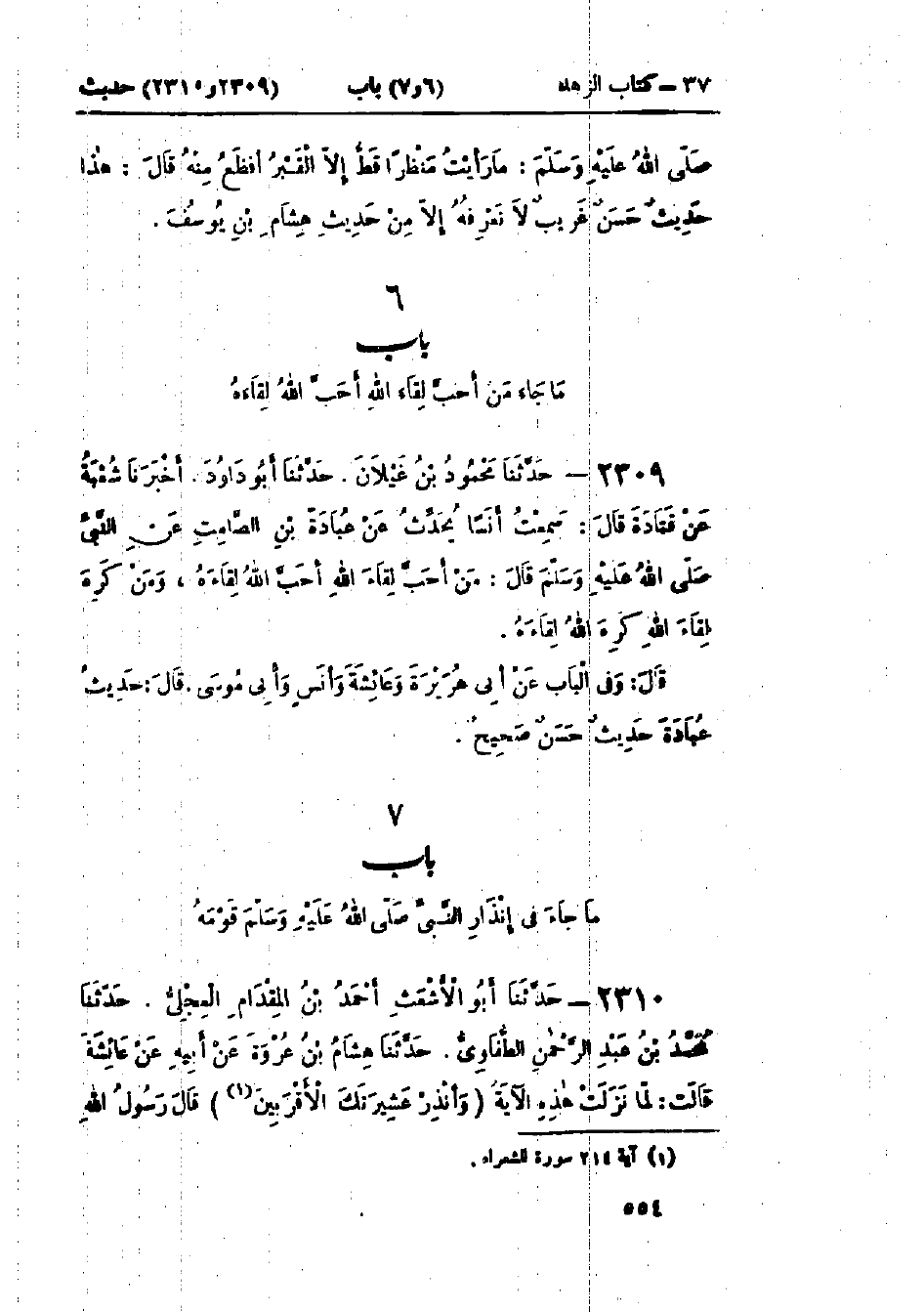 2309 - حَدَّثَنَا مَحْمُودُ بْنُ غَيْلَانَ قَالَ: حَدَّثَنَا أَبُو دَاوُدَ قَالَ: أَخْبَرَنَا شُعْبَةُ، عَنْ قَتَادَةَ، قَالَ: سَمِعْتُ أَنَسًا، يُحَدِّثُ عَنْ عُبَادَةَ بْنِ الصَّامِتِ، عَنِ النَّبِيِّ صَلَّى اللَّهُ عَلَيْهِ وَسَلَّمَ قَالَ: «§مَنْ أَحَبَّ لِقَاءَ اللَّهِ أَحَبَّ اللَّهُ لِقَاءَهُ، وَمَنْ كَرِهَ لِقَاءَ اللَّهِ كَرِهَ اللَّهُ لِقَاءَهُ» وَفِي البَاب عَنْ أَبِي هُرَيْرَةَ، وَعَائِشَةَ، وَأَنَسٍ، وَأَبِي مُوسَى «حَدِيثُ عُبَادَةَ حَدِيثٌ حَسَنٌ صَحِيحٌ»