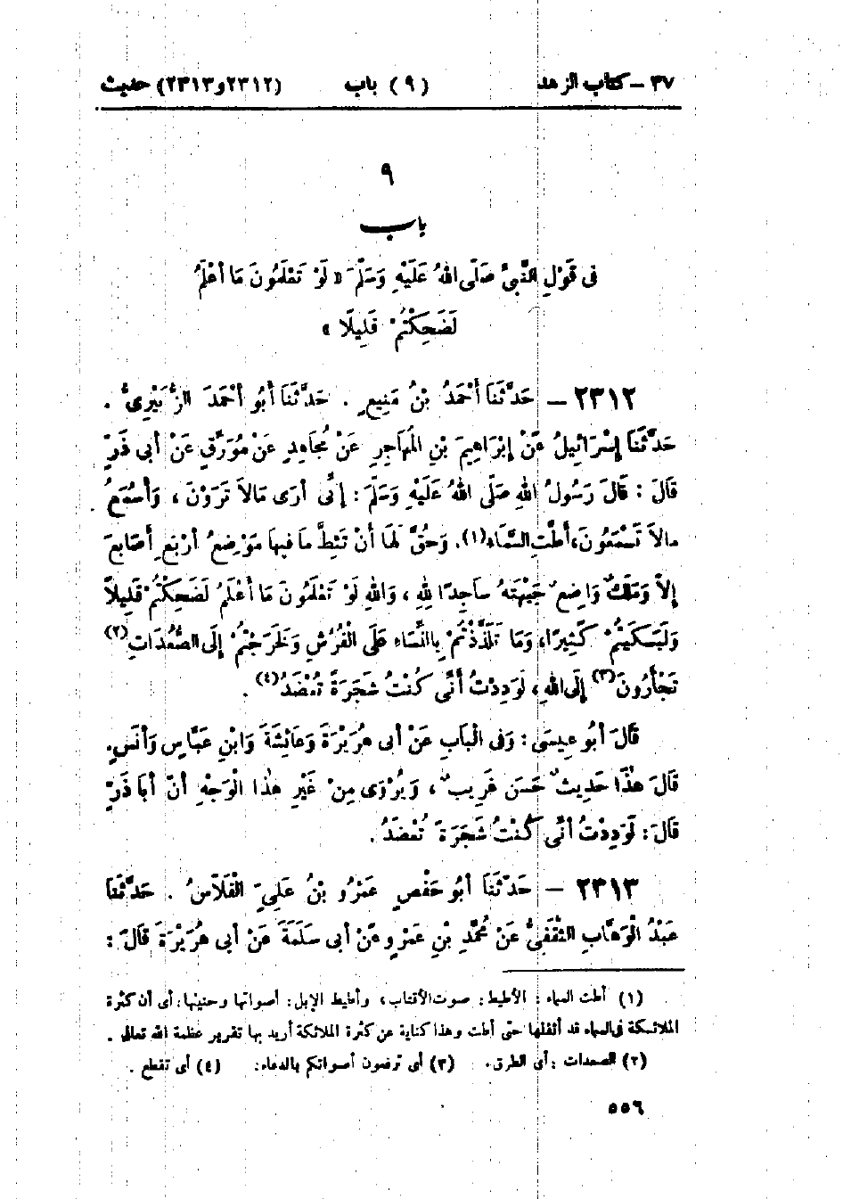 2312 - حَدَّثَنَا أَحْمَدُ بْنُ مَنِيعٍ قَالَ: حَدَّثَنَا أَبُو أَحْمَدَ الزُّبَيْرِيُّ قَالَ: حَدَّثَنَا إِسْرَائِيلُ، عَنْ إِبْرَاهِيمَ بْنِ المُهَاجِرِ، عَنْ مُجَاهِدٍ، عَنْ مُوَرِّقٍ، عَنْ أَبِي ذَرٍّ، قَالَ: قَالَ رَسُولُ اللَّهِ صَلَّى اللَّهُ عَلَيْهِ وَسَلَّمَ: «§إِنِّي أَرَى مَا لَا تَرَوْنَ، وَأَسْمَعُ مَا لَا تَسْمَعُونَ أَطَّتِ السَّمَاءُ، وَحُقَّ لَهَا أَنْ تَئِطَّ مَا فِيهَا مَوْضِعُ أَرْبَعِ أَصَابِعَ إِلَّا وَمَلَكٌ وَاضِعٌ جَبْهَتَهُ سَاجِدًا لِلَّهِ، وَاللَّهِ لَوْ تَعْلَمُونَ مَا أَعْلَمُ لَضَحِكْتُمْ قَلِيلًا وَلَبَكَيْتُمْ كَثِيرًا، وَمَا تَلَذَّذْتُمْ بِالنِّسَاءِ عَلَى الفُرُشِ وَلَخَرَجْتُمْ إِلَى الصُّعُدَاتِ تَجْأَرُونَ إِلَى اللَّهِ، لَوَدِدْتُ أَنِّي كُنْتُ شَجَرَةً تُعْضَدُ» وَفِي البَابِ عَنْ أَبِي هُرَيْرَةَ، وَعَائِشَةَ، وَابْنِ عَبَّاسٍ، وَأَنَسٍ. هَذَا حَدِيثٌ حَسَنٌ غَرِيبٌ. وَيُرْوَى مِنْ غَيْرِ هَذَا الوَجْهِ أَنَّ أَبَا ذَرٍّ، قَالَ: «لَوَدِدْتُ أَنِّي كُنْتُ شَجَرَةً تُعْضَدُ»، وَيُرْوَى عَنْ أَبِي ذَرٍّ مَوْقُوفًا
