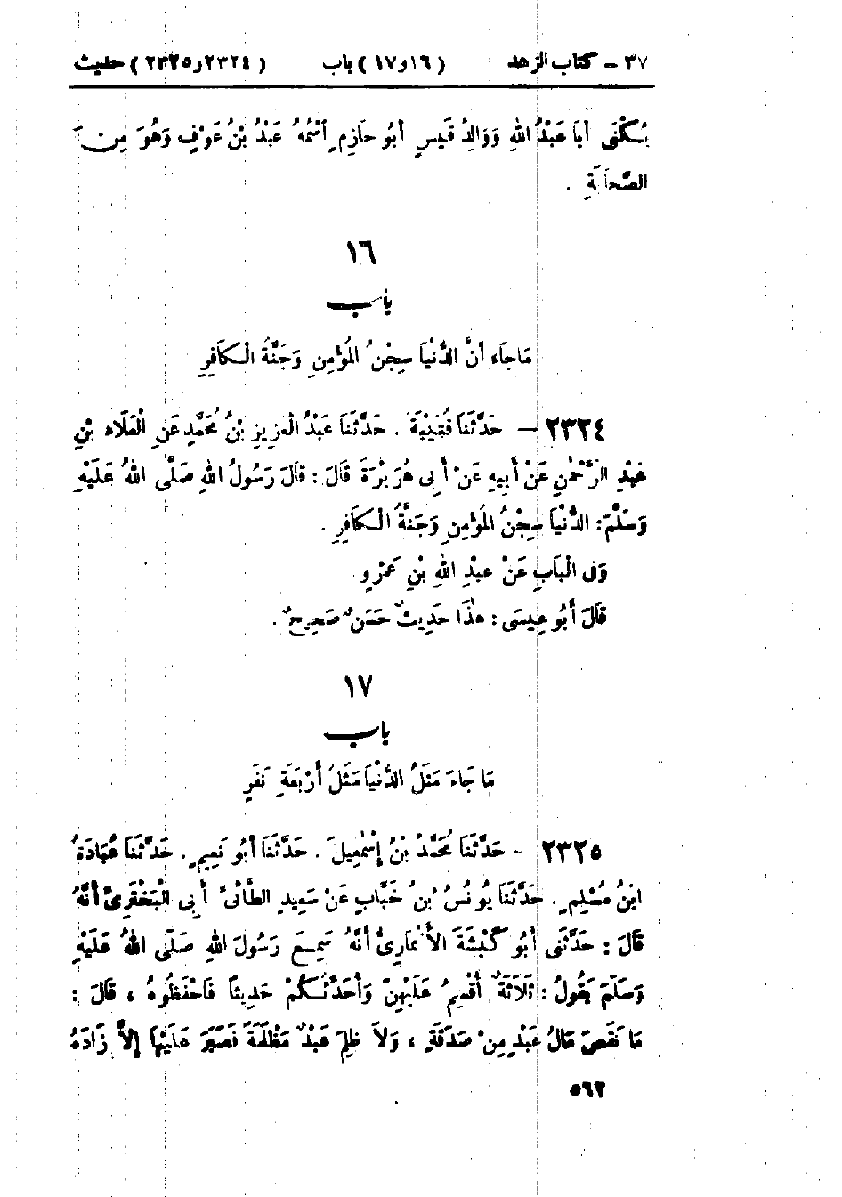2324 - حَدَّثَنَا قُتَيْبَةُ قَالَ: حَدَّثَنَا عَبْدُ العَزِيزِ بْنُ مُحَمَّدٍ، عَنْ العَلَاءِ بْنِ عَبْدِ الرَّحْمَنِ، عَنْ أَبِيهِ، عَنْ أَبِي هُرَيْرَةَ، قَالَ: قَالَ رَسُولُ اللَّهِ صَلَّى اللَّهُ عَلَيْهِ وَسَلَّمَ: «§الدُّنْيَا سِجْنُ المُؤْمِنِ وَجَنَّةُ الكَافِرِ» وَفِي البَاب عَنْ عَبْدِ اللَّهِ بْنِ عَمْرٍو: «هَذَا حَدِيثٌ حَسَنٌ صَحِيحٌ»