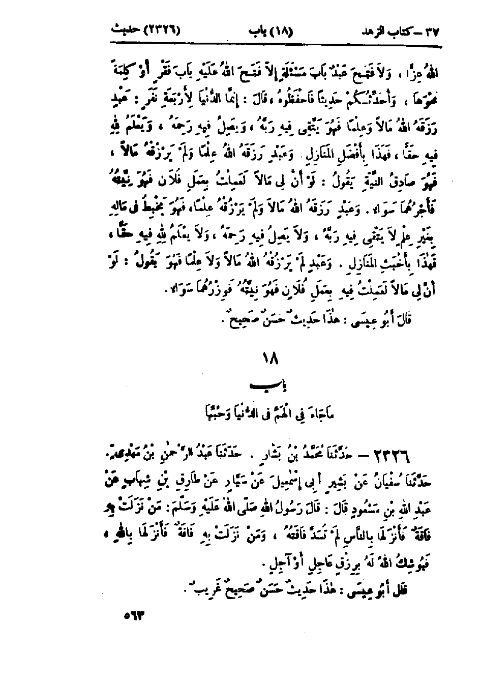 2326 - حَدَّثَنَا مُحَمَّدُ بْنُ بَشَّارٍ قَالَ: حَدَّثَنَا عَبْدُ الرَّحْمَنِ بْنُ مَهْدِيٍّ قَالَ: حَدَّثَنَا سُفْيَانُ، عَنْ بَشِيرٍ أَبِي إِسْمَاعِيلَ، عَنْ سَيَّارٍ، عَنْ طَارِقِ بْنِ شِهَابٍ، عَنْ عَبْدِ اللَّهِ بْنِ مَسْعُودٍ، قَالَ: قَالَ رَسُولُ اللَّهِ صَلَّى اللَّهُ عَلَيْهِ وَسَلَّمَ: «§مَنْ نَزَلَتْ بِهِ فَاقَةٌ فَأَنْزَلَهَا بِالنَّاسِ لَمْ تُسَدَّ فَاقَتُهُ، وَمَنْ نَزَلَتْ بِهِ فَاقَةٌ فَأَنْزَلَهَا بِاللَّهِ، فَيُوشِكُ اللَّهُ لَهُ بِرِزْقٍ عَاجِلٍ أَوْ آجِلٍ»: «هَذَا حَدِيثٌ حَسَنٌ صَحِيحٌ غَرِيبٌ»