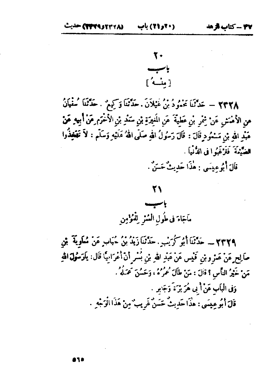 2329 - حَدَّثَنَا أَبُو كُرَيْبٍ قَالَ: حَدَّثَنَا زَيْدُ بْنُ حُبَابٍ، عَنْ مُعَاوِيَةَ بْنِ صَالِحٍ، عَنْ عَمْرِو بْنِ قَيْسٍ، عَنْ عَبْدِ اللَّهِ بْنِ بُسْرٍ، أَنَّ أَعْرَابِيًّا قَالَ: يَا رَسُولَ اللَّهِ مَنْ خَيْرُ النَّاسِ؟ قَالَ: «§مَنْ طَالَ عُمُرُهُ، وَحَسُنَ عَمَلُهُ» وَفِي البَاب عَنْ أَبِي هُرَيْرَةَ، وَجَابِرٍ: «هَذَا حَدِيثٌ حَسَنٌ غَرِيبٌ مِنْ هَذَا الوَجْهِ»