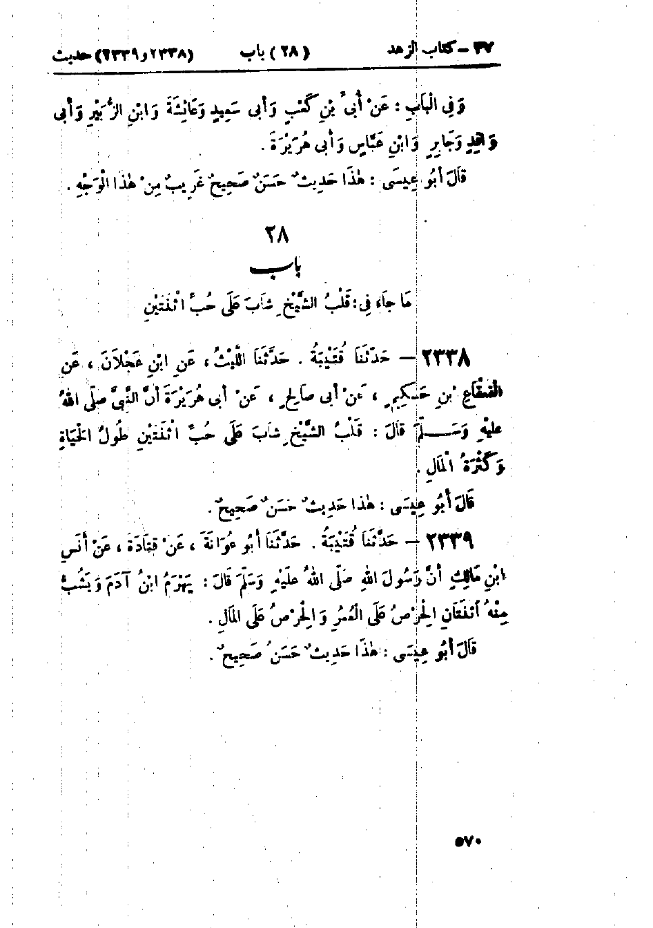 2338 - حَدَّثَنَا قُتَيْبَةُ قَالَ: حَدَّثَنَا اللَّيْثُ، عَنْ ابْنِ عَجْلَانَ، عَنْ القَعْقَاعِ بْنِ حَكِيمٍ، عَنْ أَبِي صَالِحٍ، عَنْ أَبِي هُرَيْرَةَ، أَنَّ النَّبِيَّ صَلَّى اللَّهُ عَلَيْهِ وَسَلَّمَ قَالَ: " §قَلْبُ الشَّيْخِ شَابٌّ عَلَى حُبِّ اثْنَتَيْنِ: طُولِ الحَيَاةِ وَكَثْرَةِ المَالِ ": هَذَا حَدِيثٌ حَسَنٌ صَحِيحٌ. وَفِي الْبَاب عَنْ أَنَسٍ