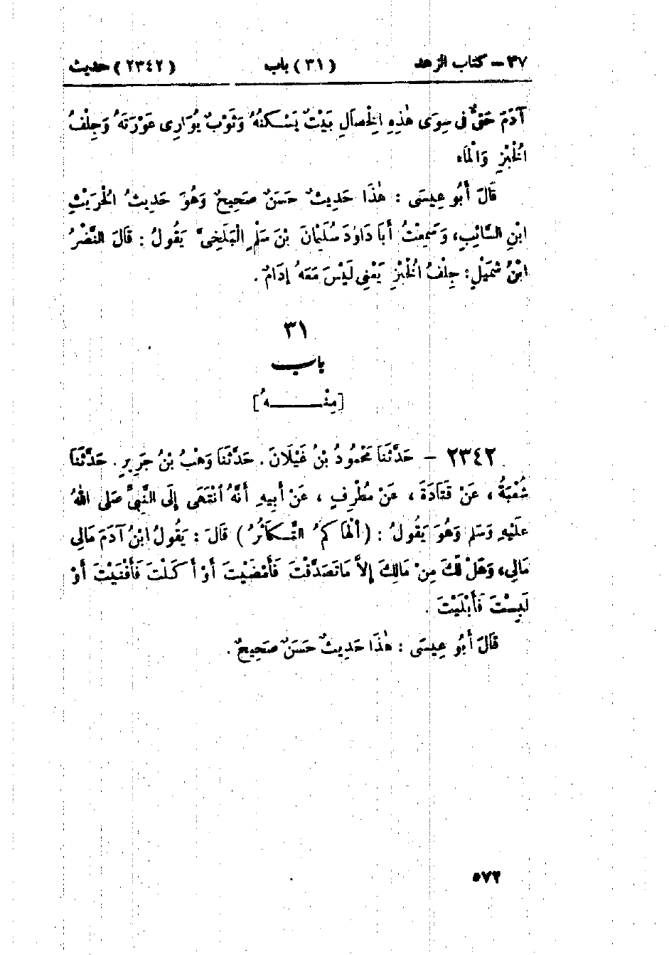 2342 - حَدَّثَنَا مَحْمُودُ بْنُ غَيْلَانَ قَالَ: حَدَّثَنَا وَهْبُ بْنُ جَرِيرٍ قَالَ: حَدَّثَنَا شُعْبَةُ، عَنْ قَتَادَةَ، عَنْ مُطَرِّفٍ، عَنْ أَبِيهِ، أَنَّهُ انْتَهَى إِلَى النَّبِيِّ صَلَّى اللَّهُ عَلَيْهِ وَسَلَّمَ وَهُوَ يَقُولُ: أَلْهَاكُمُ التَّكَاثُرُ قَالَ: " يَقُولُ ابْنُ آدَمَ: §مَالِي مَالِي، وَهَلْ لَكَ مِنْ مَالِكَ إِلَّا مَا تَصَدَّقْتَ فَأَمْضَيْتَ، أَوْ أَكَلْتَ فَأَفْنَيْتَ، أَوْ لَبِسْتَ فَأَبْلَيْتَ ": «هَذَا حَدِيثٌ حَسَنٌ صَحِيحٌ»
