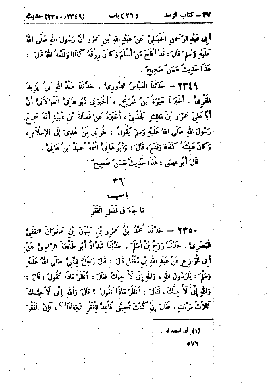 2349 - حَدَّثَنَا العَبَّاسُ الدُّورِيُّ قَالَ: حَدَّثَنَا عَبْدُ اللَّهِ بْنُ يَزِيدَ المُقْرِئُ قَالَ: أَخْبَرَنَا حَيْوَةُ بْنُ شُرَيْحٍ قَالَ: أَخْبَرَنِي أَبُو هَانِئٍ الخَوْلَانِيُّ، أَنَّ أَبَا عَلِيٍّ عَمْرَو بْنَ مَالِكٍ الجَنْبِيَّ، أَخْبَرَهُ عَنْ فَضَالَةَ بْنِ عُبَيْدٍ، أَنَّهُ سَمِعَ رَسُولَ اللَّهِ صَلَّى اللَّهُ عَلَيْهِ وَسَلَّمَ يَقُولُ: «§طُوبَى لِمَنْ هُدِيَ إِلَى الإِسْلَامِ، وَكَانَ عَيْشُهُ كَفَافًا وَقَنَعَ» وَأَبُو هَانِئٍ اسْمُهُ: حُمَيْدُ بْنُ هَانِئٍ ": «هَذَا حَدِيثٌ صَحِيحٌ»