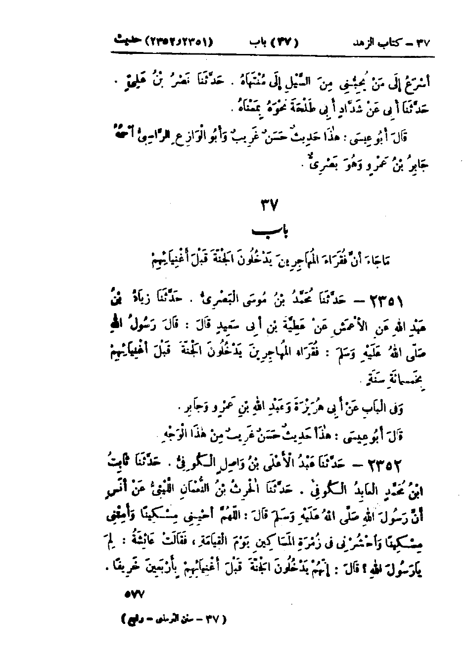 2351 - حَدَّثَنَا مُحَمَّدُ بْنُ مُوسَى البَصْرِيُّ قَالَ: حَدَّثَنَا زِيَادُ بْنُ عَبْدِ اللَّهِ، عَنْ الأَعْمَشِ، عَنْ عَطِيَّةَ، عَنْ أَبِي سَعِيدٍ، قَالَ: قَالَ رَسُولُ اللَّهِ صَلَّى اللَّهُ عَلَيْهِ وَسَلَّمَ: «§فُقَرَاءُ المُهَاجِرِينَ يَدْخُلُونَ الجَنَّةَ قَبْلَ أَغْنِيَائِهِمْ بِخَمْسِمِائَةِ سَنَةٍ» وَفِي البَاب عَنْ أَبِي هُرَيْرَةَ، وَعَبْدِ اللَّهِ بْنِ عَمْرٍو، وَجَابِرٍ: «هَذَا حَدِيثٌ حَسَنٌ غَرِيبٌ مِنْ هَذَا الوَجْهِ»