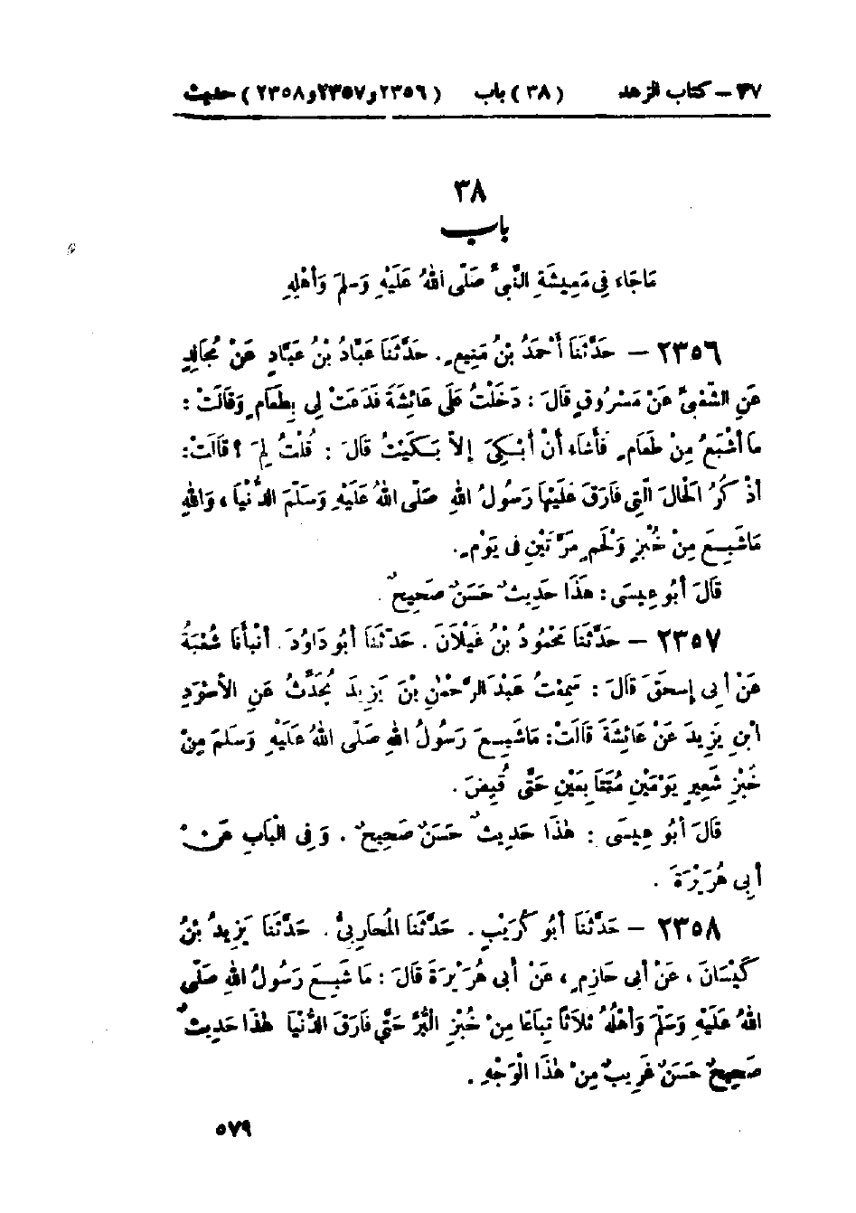 2356 - حَدَّثَنَا أَحْمَدُ بْنُ مَنِيعٍ قَالَ: حَدَّثَنَا عَبَّادُ بْنُ عَبَّادٍ، عَنْ مُجَالِدٍ، عَنْ الشَّعْبِيِّ، عَنْ مَسْرُوقٍ، قَالَ: دَخَلْتُ عَلَى عَائِشَةَ، فَدَعَتْ لِي بِطَعَامٍ وَقَالَتْ: «مَا أَشْبَعُ مِنْ طَعَامٍ فَأَشَاءُ أَنْ أَبْكِيَ إِلَّا بَكَيْتُ» قَالَ: قُلْتُ لِمَ؟ قَالَتْ: «أَذْكُرُ الحَالَ الَّتِي فَارَقَ عَلَيْهَا رَسُولُ اللَّهِ صَلَّى اللَّهُ عَلَيْهِ وَسَلَّمَ الدُّنْيَا، §وَاللَّهِ مَا شَبِعَ مِنْ خُبْزٍ وَلَحْمٍ مَرَّتَيْنِ فِي يَوْمٍ»: «هَذَا حَدِيثٌ حَسَنٌ»