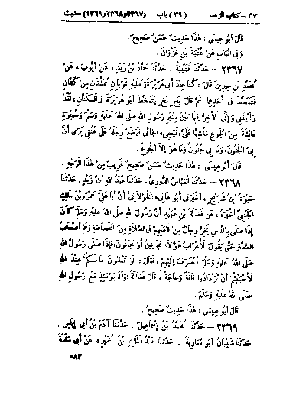 2367 - حَدَّثَنَا قُتَيْبَةُ قَالَ: حَدَّثَنَا حَمَّادُ بْنُ زَيْدٍ، عَنْ أَيُّوبَ، عَنْ مُحَمَّدِ بْنِ سِيرِينَ، قَالَ: كُنَّا عِنْدَ أَبِي هُرَيْرَةَ، وَعَلَيْهِ ثَوْبَانِ مُمَشَّقَانِ مِنْ كَتَّانٍ فَتَمَخَّطَ فِي أَحَدِهِمَا ثُمَّ قَالَ: «§بَخٍ بَخٍ يَتَمَخَّطُ أَبُو هُرَيْرَةَ فِي الكَتَّانِ، لَقَدْ رَأَيْتُنِي وَإِنِّي لَأَخِرُّ فِيمَا بَيْنَ مِنْبَرِ رَسُولِ اللَّهِ صَلَّى اللَّهُ عَلَيْهِ وَسَلَّمَ وَحُجْرَةِ عَائِشَةَ مِنَ الجُوعِ مَغْشِيًّا عَلَيَّ، فَيَجِيءُ الجَائِي فَيَضَعُ رِجْلَهُ عَلَى عُنُقِي يَرَى أَنَّ بِيَ الجُنُونَ، وَمَا بِي جُنُونٌ وَمَا هُوَ إِلَّا الجُوعُ»: «هَذَا حَدِيثٌ حَسَنٌ صَحِيحٌ غَرِيبٌ مِنْ هَذَا الوَجْهِ»