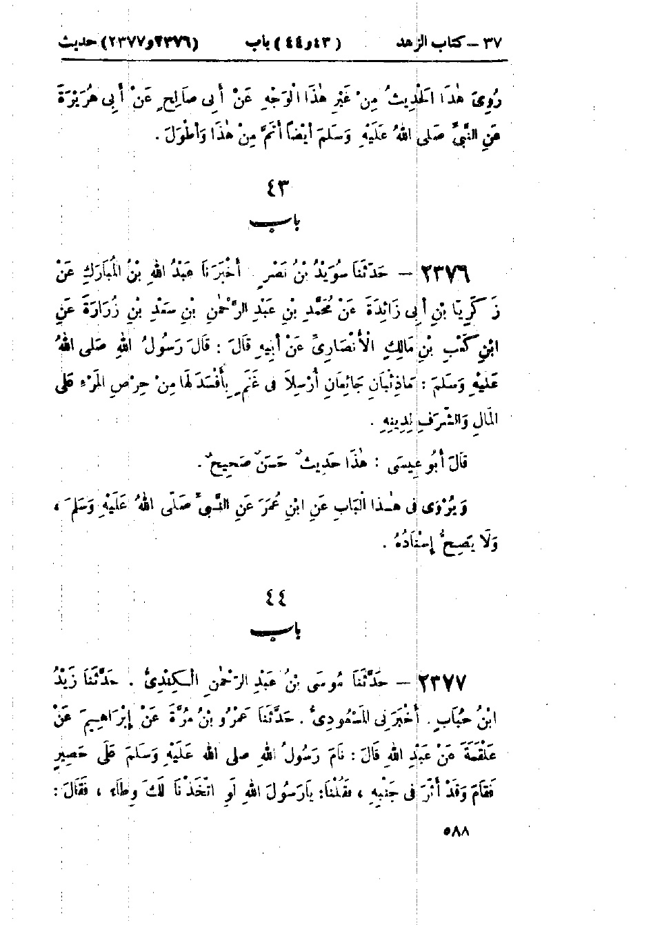 2376 - حَدَّثَنَا سُوَيْدُ بْنُ نَصْرٍ قَالَ: أَخْبَرَنَا عَبْدُ اللَّهِ بْنُ المُبَارَكِ، عَنْ زَكَرِيَّا بْنِ أَبِي زَائِدَةَ، عَنْ مُحَمَّدِ بْنِ عَبْدِ الرَّحْمَنِ بْنِ سَعْدِ بْنِ زُرَارَةَ، عَنِ ابْنِ كَعْبِ بْنِ مَالِكٍ الْأَنْصَارِيِّ، عَنْ أَبِيهِ، قَالَ: قَالَ رَسُولُ اللَّهِ صَلَّى اللَّهُ عَلَيْهِ وَسَلَّمَ: «§مَا ذِئْبَانِ جَائِعَانِ أُرْسِلَا فِي غَنَمٍ بِأَفْسَدَ لَهَا مِنْ حِرْصِ المَرْءِ عَلَى المَالِ وَالشَّرَفِ لِدِينِهِ». هَذَا حَدِيثٌ حَسَنٌ صَحِيحٌ. وَيُرْوَى فِي هَذَا الْبَابِ عَنِ ابْنِ عُمَرَ عَنِ النَّبِيِّ صَلَّى اللَّهُ عَلَيْهِ وَسَلَّمَ، وَلَا يَصِحُّ إِسْنَادُهُ