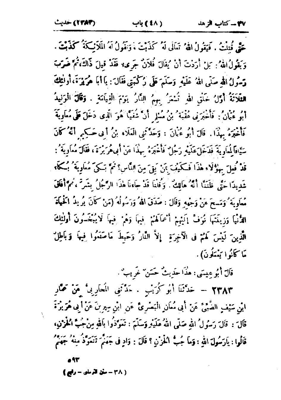 2383 - حَدَّثَنَا أَبُو كُرَيْبٍ قَالَ: حَدَّثَنِي المُحَارِبِيُّ، عَنْ عَمَّارِ بْنِ سَيْفٍ الضَّبِّيِّ، عَنْ أَبِي مُعَانٍ البَصْرِيِّ، عَنْ ابْنِ سِيرِينَ، عَنْ أَبِي هُرَيْرَةَ، قَالَ: قَالَ رَسُولُ اللَّهِ صَلَّى اللَّهُ عَلَيْهِ وَسَلَّمَ: «§تَعَوَّذُوا بِاللَّهِ مِنْ جُبِّ الحَزَنِ»، قَالُوا: يَا رَسُولَ اللَّهِ: وَمَا جُبُّ الحَزَنِ؟ قَالَ: «وَادٍ فِي جَهَنَّمَ تَتَعَوَّذُ مِنْهُ جَهَنَّمُ -[594]- كُلَّ يَوْمٍ مِائَةَ مَرَّةٍ». قُلْنَا: يَا رَسُولَ اللَّهِ وَمَنْ يَدْخُلُهُ؟ قَالَ: «الْقَرَّاءُونَ الْمُرَاءُونَ بِأَعْمَالِهِمْ» هَذَا حَدِيثٌ غَرِيبٌ