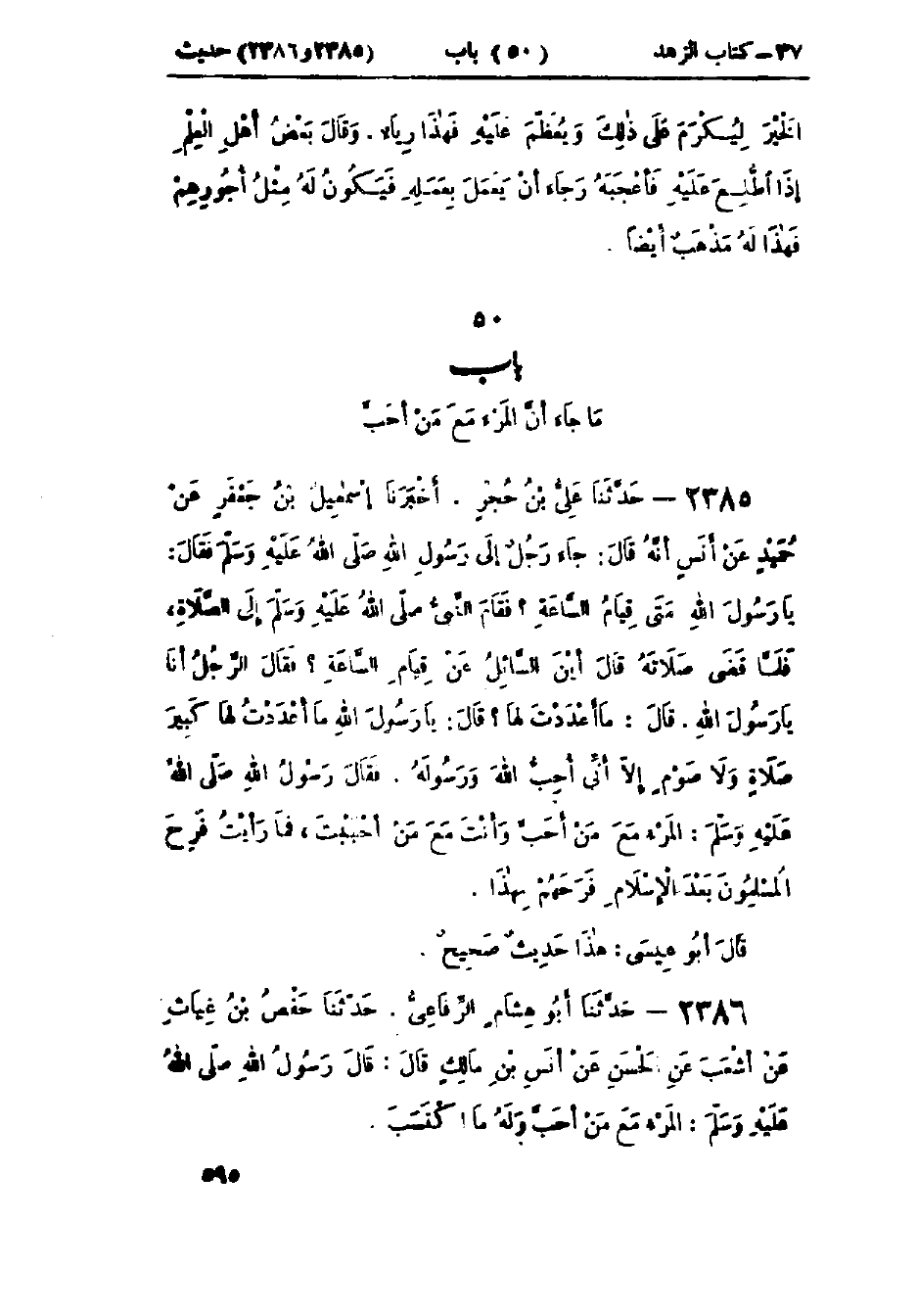 2385 - حَدَّثَنَا عَلِيُّ بْنُ حُجْرٍ قَالَ: أَخْبَرَنَا إِسْمَاعِيلُ بْنُ جَعْفَرٍ، عَنْ حُمَيْدٍ، عَنْ أَنَسٍ، أَنَّهُ قَالَ: جَاءَ رَجُلٌ إِلَى رَسُولِ اللَّهِ صَلَّى اللَّهُ عَلَيْهِ وَسَلَّمَ فَقَالَ: يَا رَسُولَ اللَّهِ مَتَى قِيَامُ السَّاعَةِ؟ فَقَامَ النَّبِيُّ صَلَّى اللَّهُ عَلَيْهِ وَسَلَّمَ إِلَى الصَّلَاةِ، فَلَمَّا قَضَى صَلَاتَهُ قَالَ: «أَيْنَ السَّائِلُ عَنْ قِيَامِ السَّاعَةِ»؟ فَقَالَ الرَّجُلُ: أَنَا يَا رَسُولَ اللَّهِ. قَالَ: «مَا أَعْدَدْتَ لَهَا»؟ قَالَ: يَا رَسُولَ اللَّهِ مَا أَعْدَدْتُ لَهَا كَبِيرَ صَلَاةٍ وَلَا صَوْمٍ إِلَّا أَنِّي أُحِبُّ اللَّهَ وَرَسُولَهُ. فَقَالَ رَسُولُ اللَّهِ صَلَّى اللَّهُ عَلَيْهِ وَسَلَّمَ: «§المَرْءُ مَعَ مَنْ أَحَبَّ وَأَنْتَ مَعَ مَنْ أَحْبَبْتَ» فَمَا رَأَيْتُ فَرِحَ المُسْلِمُونَ بَعْدَ الإِسْلَامِ فَرَحَهُمْ بِهَذَا ": «هَذَا حَدِيثٌ حَسَنٌ صَحِيحٌ»