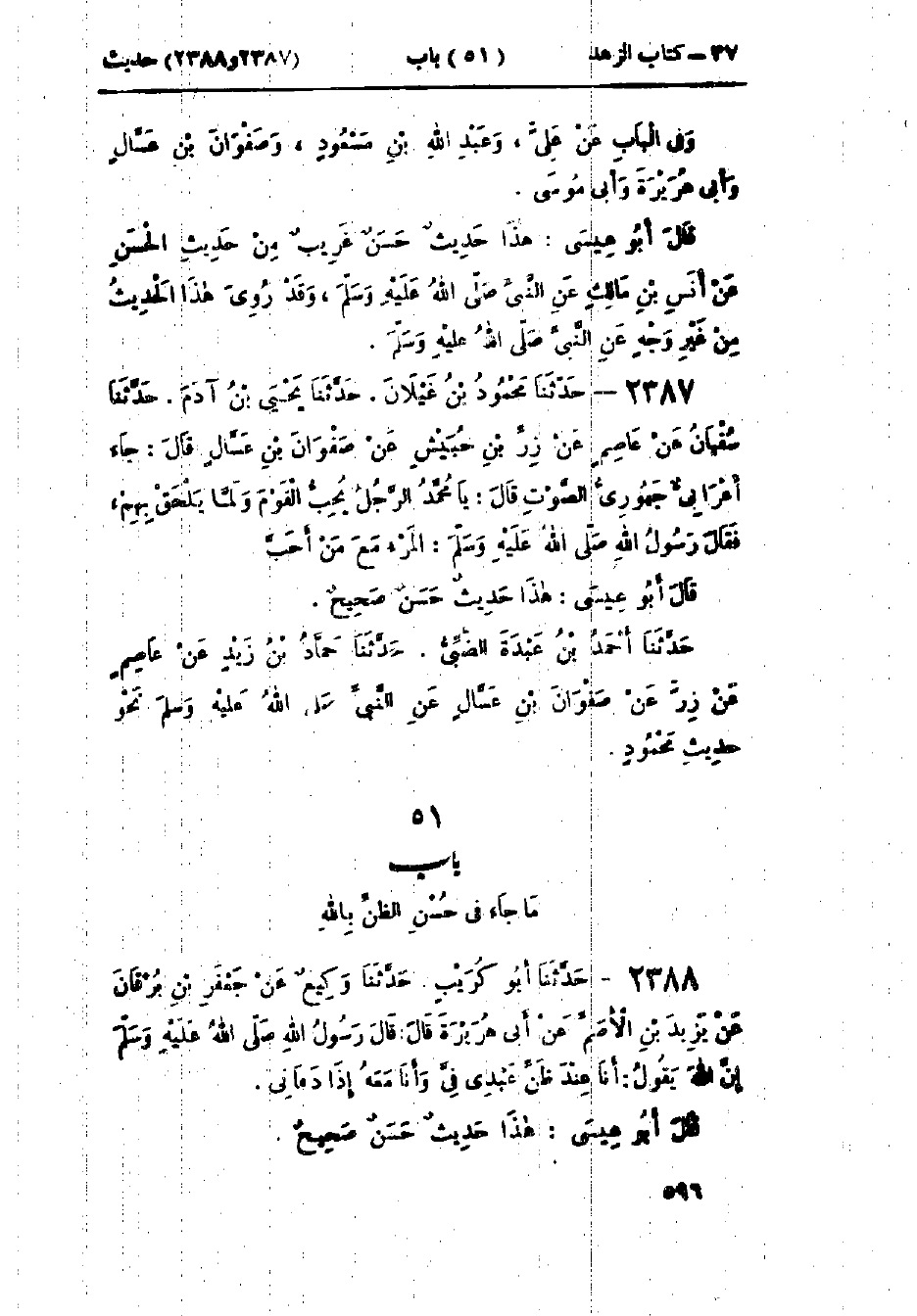 2387 - حَدَّثَنَا مَحْمُودُ بْنُ غَيْلَانَ قَالَ: حَدَّثَنَا يَحْيَى بْنُ آدَمَ قَالَ: حَدَّثَنَا سُفْيَانُ، عَنْ عَاصِمٍ، عَنْ زِرِّ بْنِ حُبَيْشٍ، عَنْ صَفْوَانَ بْنِ عَسَّالٍ، قَالَ: جَاءَ أَعْرَابِيٌّ جَهْوَرِيُّ الصَّوْتِ قَالَ: يَا مُحَمَّدُ الرَّجُلُ يُحِبُّ القَوْمَ وَلَمَّا يَلْحَقْ بِهِمْ، فَقَالَ رَسُولُ اللَّهِ صَلَّى اللَّهُ عَلَيْهِ وَسَلَّمَ: «§المَرْءُ مَعَ مَنْ أَحَبَّ»: «هَذَا حَدِيثٌ حَسَنٌ صَحِيحٌ» حَدَّثَنَا أَحْمَدُ بْنُ عَبْدَةَ الضَّبِّيُّ قَالَ: حَدَّثَنَا حَمَّادُ بْنُ زَيْدٍ، عَنْ عَاصِمٍ، عَنْ زِرٍّ، عَنْ صَفْوَانَ بْنِ عَسَّالٍ، عَنِ النَّبِيِّ صَلَّى اللَّهُ عَلَيْهِ وَسَلَّمَ نَحْوَ حَدِيثِ مَحْمُودٍ