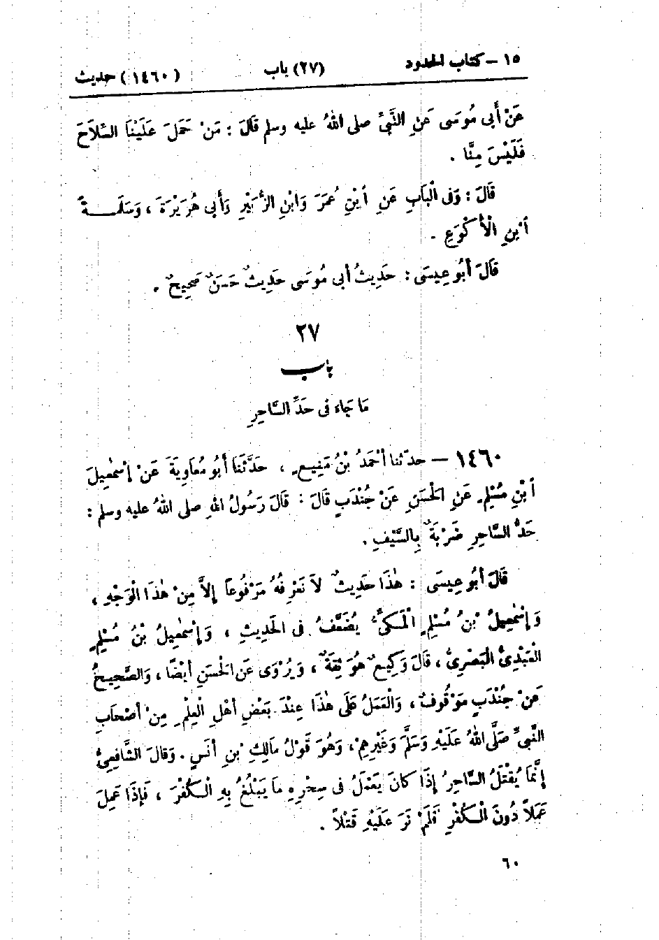 1460 - حَدَّثَنَا أَحْمَدُ بْنُ مَنِيعٍ قَالَ: حَدَّثَنَا أَبُو مُعَاوِيَةَ، عَنْ إِسْمَاعِيلَ بْنِ مُسْلِمٍ، عَنْ الحَسَنِ، عَنْ جُنْدُبٍ قَالَ: قَالَ رَسُولُ اللَّهِ صَلَّى اللَّهُ عَلَيْهِ وَسَلَّمَ: «§حَدُّ السَّاحِرِ ضَرْبَةٌ بِالسَّيْفِ»: هَذَا حَدِيثٌ لَا نَعْرِفُهُ مَرْفُوعًا إِلَّا مِنْ هَذَا الوَجْهِ وَإِسْمَاعِيلُ بْنُ مُسْلِمٍ المَكِّيُّ يُضَعَّفُ فِي الحَدِيثِ مِنْ قِبَلِ حِفْظِهِ وَإِسْمَاعِيلُ بْنُ مُسْلِمٍ العَبْدِيُّ البَصْرِيُّ قَالَ: وَكِيعٌ هُوَ ثِقَةٌ وَيَرْوِي عَنِ الْحَسَنِ أَيْضًا، وَالصَّحِيحُ عَنْ جُنْدَبٍ مَوْقُوفًا وَالعَمَلُ عَلَى هَذَا عِنْدَ بَعْضِ أَهْلِ العِلْمِ مِنْ أَصْحَابِ النَّبِيِّ صَلَّى اللَّهُ عَلَيْهِ وَسَلَّمَ، وَغَيْرِهِمْ، وَهُوَ قَوْلُ مَالِكِ بْنِ أَنَسٍ وقَالَ الشَّافِعِيُّ: " إِنَّمَا يُقْتَلُ السَّاحِرُ إِذَا كَانَ يَعْمَلُ فِي سِحْرِهِ مَا يَبْلُغُ بِهِ الكُفْرَ، فَإِذَا عَمِلَ عَمَلًا دُونَ الكُفْرِ فَلَمْ نَرَ عَلَيْهِ قَتْلًا