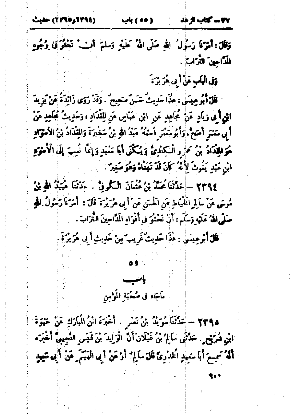 2394 - حَدَّثَنَا مُحَمَّدُ بْنُ عُثْمَانَ الكُوفِيُّ قَالَ: حَدَّثَنَا عُبَيْدُ اللَّهِ بْنُ مُوسَى، عَنْ سَالِمٍ الخَيَّاطِ، عَنْ الحَسَنِ، عَنْ أَبِي هُرَيْرَةَ، قَالَ: «§أَمَرَنَا رَسُولُ اللَّهِ صَلَّى اللَّهُ عَلَيْهِ وَسَلَّمَ أَنْ نَحْثُوَ فِي أَفْوَاهِ المَدَّاحِينَ التُّرَابَ»: «هَذَا حَدِيثٌ غَرِيبٌ مِنْ حَدِيثِ أَبِي هُرَيْرَةَ»