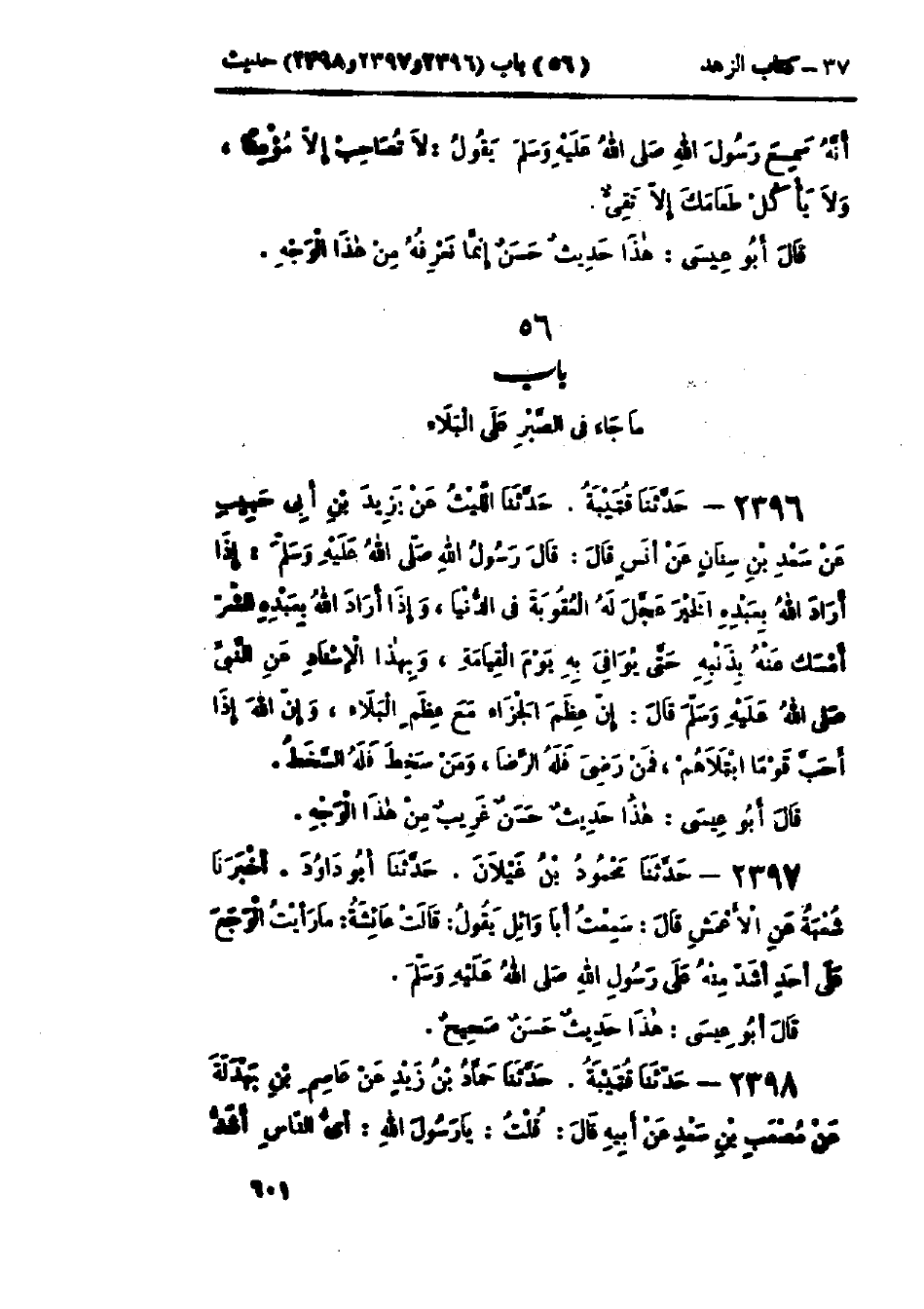 2398 - حَدَّثَنَا قُتَيْبَةُ قَالَ: حَدَّثَنَا حَمَّادُ بْنُ زَيْدٍ، عَنْ عَاصِمِ ابْنِ بَهْدَلَةَ، عَنْ مُصْعَبِ بْنِ سَعْدٍ، عَنْ أَبِيهِ، قَالَ: قُلْتُ: يَا رَسُولَ اللَّهِ، أَيُّ النَّاسِ أَشَدُّ -[602]- بَلَاءً؟ قَالَ: «§الأَنْبِيَاءُ ثُمَّ الأَمْثَلُ فَالأَمْثَلُ، فَيُبْتَلَى الرَّجُلُ عَلَى حَسَبِ دِينِهِ، فَإِنْ كَانَ دِينُهُ صُلْبًا اشْتَدَّ بَلَاؤُهُ، وَإِنْ كَانَ فِي دِينِهِ رِقَّةٌ ابْتُلِيَ عَلَى حَسَبِ دِينِهِ، فَمَا يَبْرَحُ البَلَاءُ بِالعَبْدِ حَتَّى يَتْرُكَهُ يَمْشِي عَلَى الأَرْضِ مَا عَلَيْهِ خَطِيئَةٌ»: «هَذَا حَدِيثٌ حَسَنٌ صَحِيحٌ» وَفِي البَاب عَنْ أَبِي هُرَيْرَةَ، وَأُخْتِ حُذَيْفَةَ بْنِ اليَمَانِ أَنَّ النَّبِيَّ صَلَّى اللَّهُ عَلَيْهِ وَسَلَّمَ، سُئِلَ أَيُّ النَّاسِ أَشَدُّ بَلَاءً؟ قَالَ: «الأَنْبِيَاءُ، ثُمَّ الأَمْثَلُ فَالأَمْثَلُ»