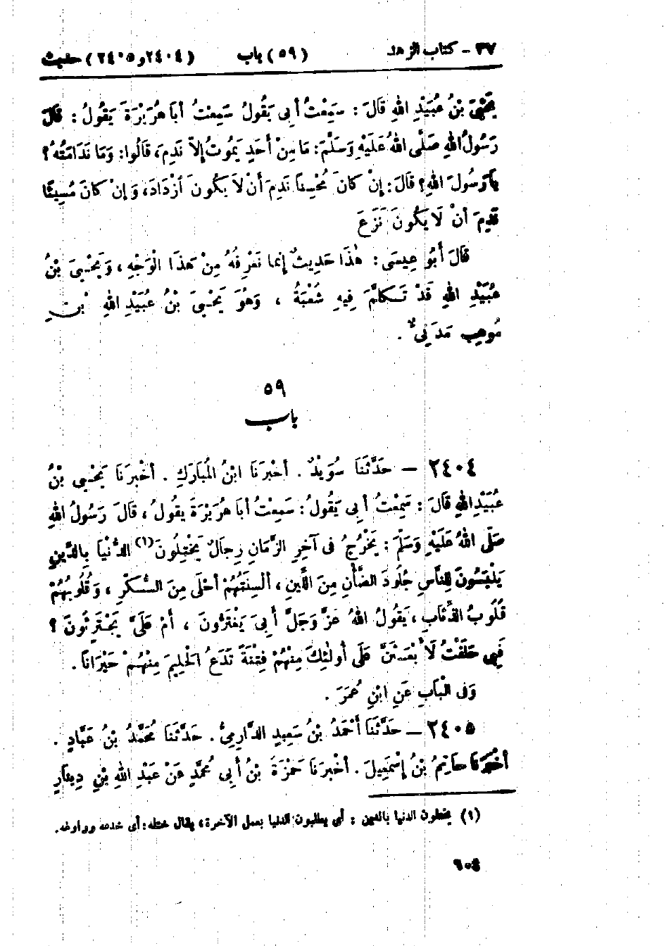 2404 - حَدَّثَنَا سُوَيْدٌ قَالَ: أَخْبَرَنَا ابْنُ المُبَارَكِ قَالَ: أَخْبَرَنَا يَحْيَى بْنُ عُبَيْدِ اللَّهِ، قَالَ: سَمِعْتُ أَبِي، يَقُولُ: سَمِعْتُ أَبَا هُرَيْرَةَ، يَقُولُ: قَالَ رَسُولُ اللَّهِ صَلَّى اللَّهُ عَلَيْهِ وَسَلَّمَ: " يَخْرُجُ فِي آخِرِ الزَّمَانِ رِجَالٌ يَخْتِلُونَ الدُّنْيَا بِالدِّينِ يَلْبَسُونَ لِلنَّاسِ جُلُودَ الضَّأْنِ مِنَ اللِّينِ، أَلْسِنَتُهُمْ أَحْلَى مِنَ السُّكَّرِ، وَقُلُوبُهُمْ قُلُوبُ الذِّئَابِ، يَقُولُ اللَّهُ عَزَّ وَجَلَّ: §أَبِي يَغْتَرُّونَ، أَمْ عَلَيَّ يَجْتَرِئُونَ؟ فَبِي حَلَفْتُ لَأَبْعَثَنَّ عَلَى أُولَئِكَ مِنْهُمْ فِتْنَةً تَدَعُ الحَلِيمَ مِنْهُمْ حَيْرَانًا " وَفِي البَاب عَنْ ابْنِ عُمَرَ