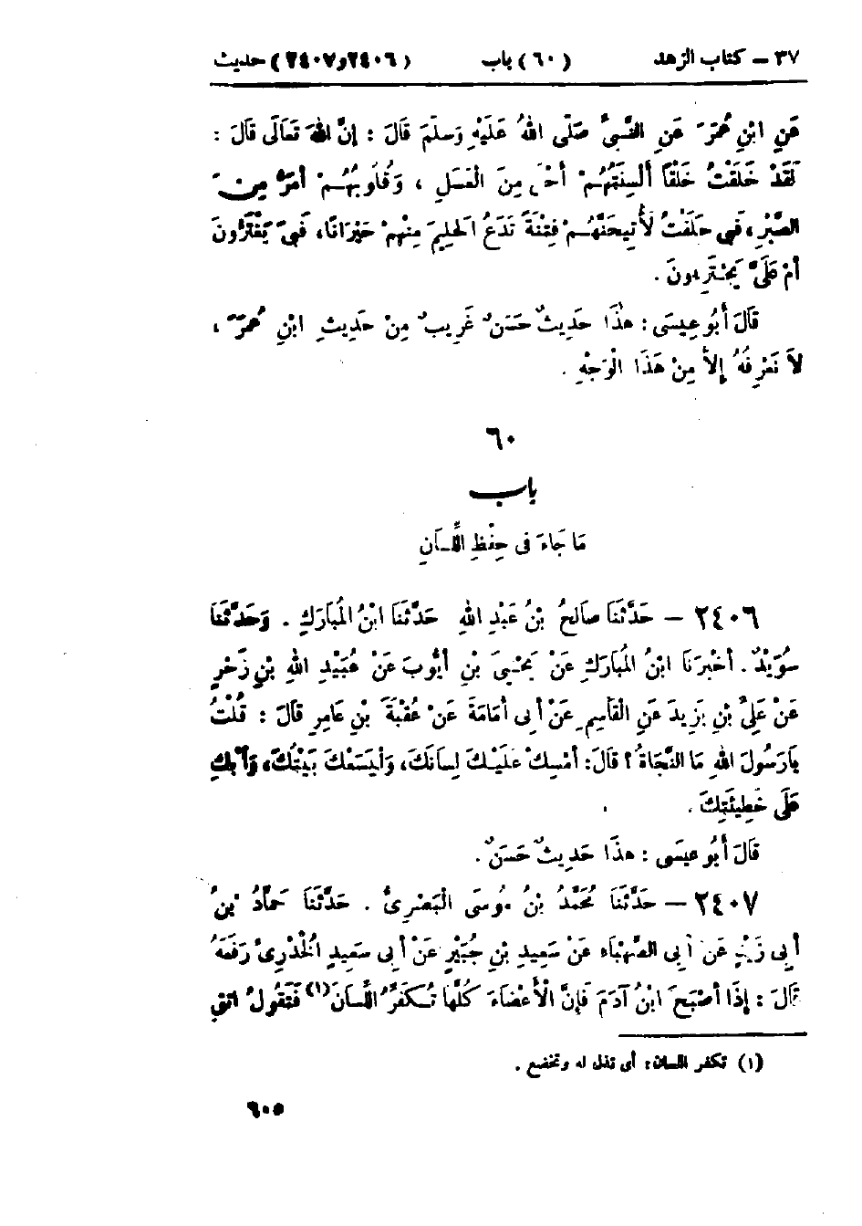 2406 - حَدَّثَنَا صَالِحُ بْنُ عَبْدِ اللَّهِ قَالَ: حَدَّثَنَا ابْنُ المُبَارَكِ، ح وحَدَّثَنَا سُوَيْدٌ قَالَ: أَخْبَرَنَا ابْنُ المُبَارَكِ، عَنْ يَحْيَى بْنِ أَيُّوبَ، عَنْ عُبَيْدِ اللَّهِ بْنِ زَحْرٍ، عَنْ عَلِيِّ بْنِ يَزِيدَ، عَنْ القَاسِمِ، عَنْ أَبِي أُمَامَةَ، عَنْ عُقْبَةَ بْنِ عَامِرٍ، قَالَ: قُلْتُ: يَا رَسُولَ اللَّهِ مَا النَّجَاةُ؟ قَالَ: «§امْلِكْ عَلَيْكَ لِسَانَكَ، وَلْيَسَعْكَ بَيْتُكَ، وَابْكِ عَلَى خَطِيئَتِكَ»: «هَذَا حَدِيثٌ حَسَنٌ»