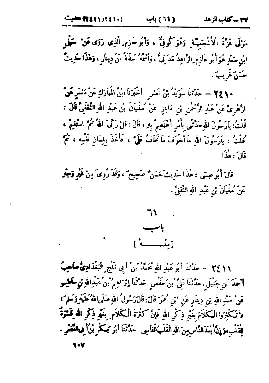 2410 - حَدَّثَنَا سُوَيْدُ بْنُ نَصْرٍ قَالَ: أَخْبَرَنَا ابْنُ المُبَارَكِ، عَنْ مَعْمَرٍ، عَنْ الزُّهْرِيِّ، عَنْ عَبْدِ الرَّحْمَنِ بْنِ مَاعِزٍ، عَنْ سُفْيَانَ بْنِ عَبْدِ اللَّهِ الثَّقَفِيِّ، قَالَ: قُلْتُ: يَا رَسُولَ اللَّهِ حَدِّثْنِي بِأَمْرٍ أَعْتَصِمُ بِهِ، قَالَ: «§قُلْ رَبِّيَ اللَّهُ ثُمَّ اسْتَقِمْ»، قُلْتُ: يَا رَسُولَ اللَّهِ مَا أَخْوَفُ مَا تَخَافُ عَلَيَّ، فَأَخَذَ بِلِسَانِ نَفْسِهِ، ثُمَّ قَالَ: «هَذَا»: «هَذَا حَدِيثٌ حَسَنٌ صَحِيحٌ وَقَدْ رُوِيَ مِنْ غَيْرِ وَجْهٍ عَنْ سُفْيَانَ بْنِ عَبْدِ اللَّهِ الثَّقَفِيِّ»