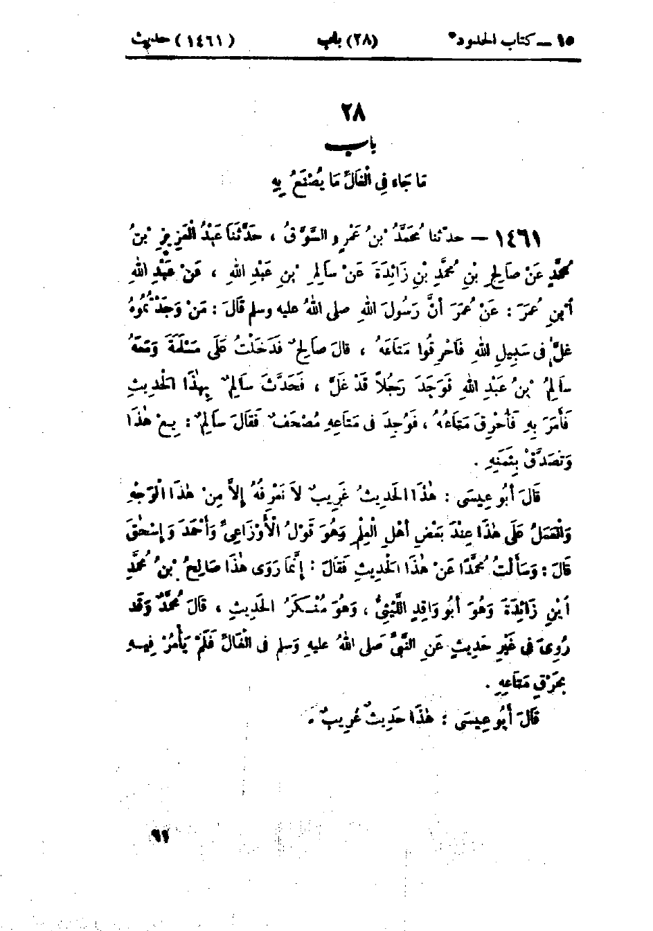 1461 - حَدَّثَنَا مُحَمَّدُ بْنُ عَمْرٍو السَّوَّاقُ قَالَ: حَدَّثَنَا عَبْدُ العَزِيزِ بْنُ مُحَمَّدٍ، عَنْ صَالِحِ بْنِ مُحَمَّدِ بْنِ زَائِدَةَ، عَنْ سَالِمِ بْنِ عَبْدِ اللَّهِ، عَنْ عَبْدِ اللَّهِ بْنِ عُمَرَ، عَنْ عُمَرَ، أَنَّ رَسُولَ اللَّهِ صَلَّى اللَّهُ عَلَيْهِ وَسَلَّمَ قَالَ: «§مَنْ وَجَدْتُمُوهُ غَلَّ فِي سَبِيلِ اللَّهِ فَاحْرِقُوا مَتَاعَهُ» قَالَ صَالِحٌ: فَدَخَلْتُ عَلَى مَسْلَمَةَ وَمَعَهُ سَالِمُ بْنُ عَبْدِ اللَّهِ، فَوَجَدَ رَجُلًا قَدْ غَلَّ، فَحَدَّثَ سَالِمٌ بِهَذَا الحَدِيثِ، فَأَمَرَ بِهِ، فَأُحْرِقَ مَتَاعُهُ، فَوُجِدَ فِي مَتَاعِهِ مُصْحَفٌ، فَقَالَ سَالِمٌ: بِعْ هَذَا وَتَصَدَّقْ بِثَمَنِهِ: هَذَا الحَدِيثُ غَرِيبٌ لَا نَعْرِفُهُ إِلَّا مِنْ هَذَا الوَجْهِ وَالعَمَلُ عَلَى هَذَا عِنْدَ بَعْضِ أَهْلِ العِلْمِ، وَهُوَ قَوْلُ الأَوْزَاعِيِّ، وَأَحْمَدَ، وَإِسْحَاقَ وَسَأَلْتُ مُحَمَّدًا عَنْ هَذَا الحَدِيثِ، فَقَالَ: إِنَّمَا رَوَى هَذَا صَالِحُ بْنُ مُحَمَّدِ بْنِ زَائِدَةَ، وَهُوَ أَبُو وَاقِدٍ اللَّيْثِيُّ وَهُوَ مُنْكَرُ الحَدِيثِ قَالَ مُحَمَّدٌ: وَقَدْ رُوِيَ فِي غَيْرِ حَدِيثٍ عَنِ النَّبِيِّ صَلَّى اللَّهُ عَلَيْهِ وَسَلَّمَ فِي الغَالِّ، فَلَمْ يَأْمُرْ فِيهِ بِحَرْقِ مَتَاعِهِ