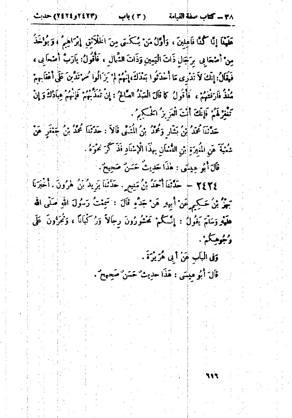 2424 - حَدَّثَنَا أَحْمَدُ بْنُ مَنِيعٍ قَالَ: حَدَّثَنَا يَزِيدُ بْنُ هَارُونَ قَالَ: أَخْبَرَنَا بَهْزُ بْنُ حَكِيمٍ، عَنْ أَبِيهِ، عَنْ جَدِّهِ، قَالَ: سَمِعْتُ رَسُولَ اللَّهِ صَلَّى اللَّهُ عَلَيْهِ وَسَلَّمَ يَقُولُ: «§إِنَّكُمْ تُحْشَرُونَ رِجَالًا وَرُكْبَانًا، وَتُجَرُّونَ عَلَى وُجُوهِكُمْ» وَفِي البَاب عَنْ أَبِي هُرَيْرَةَ: «هَذَا حَدِيثٌ حَسَنٌ»