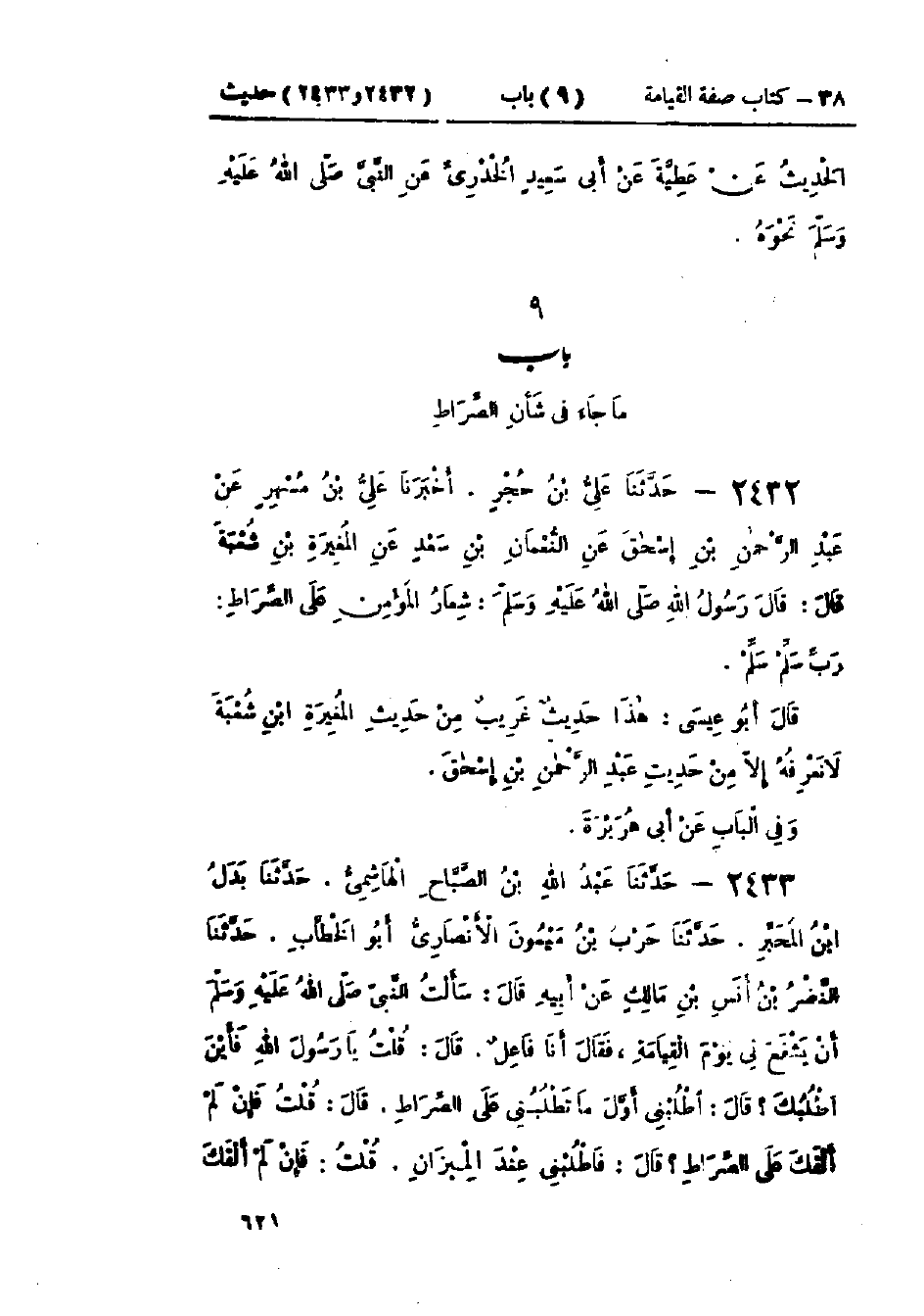 2432 - حَدَّثَنَا عَلِيُّ بْنُ حُجْرٍ قَالَ: أَخْبَرَنَا عَلِيُّ بْنُ مُسْهِرٍ، عَنْ عَبْدِ الرَّحْمَنِ بْنِ إِسْحَاقَ، عَنْ النُّعْمَانِ بْنِ سَعْدٍ، عَنْ المُغِيرَةِ بْنِ شُعْبَةَ، قَالَ: قَالَ رَسُولُ اللَّهِ صَلَّى اللَّهُ عَلَيْهِ وَسَلَّمَ: «§شِعَارُ المُؤْمِنِ عَلَى الصِّرَاطِ، رَبِّ سَلِّمْ سَلِّمْ»: «هَذَا حَدِيثٌ غَرِيبٌ مِنْ حَدِيثِ المُغِيرَةِ بْنِ شُعْبَةَ لَا نَعْرِفُهُ إِلَّا مِنْ حَدِيثِ عَبْدِ الرَّحْمَنِ بْنِ إِسْحَاقَ» وَفِي البَاب عَنْ أَبِي هُرَيْرَةَ