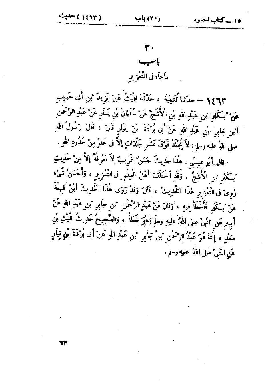 1463 - حَدَّثَنَا قُتَيْبَةُ قَالَ: حَدَّثَنَا اللَّيْثُ، عَنْ يَزِيدَ بْنِ أَبِي حَبيبٍ، عَنْ بُكَيْرِ بْنِ عَبْدِ اللَّهِ بْنِ الأَشَجِّ، عَنْ سُلَيْمَانَ بْنِ يَسَارٍ، عَنْ عَبْدِ الرَّحْمَنِ بْنِ جَابِرِ بْنِ عَبْدِ اللَّهِ، عَنْ أَبِي بُرْدَةَ بْنِ نِيَارٍ قَالَ: قَالَ رَسُولُ اللَّهِ صَلَّى اللَّهُ عَلَيْهِ وَسَلَّمَ: «§لَا يُجْلَدُ فَوْقَ عَشْرِ جَلَدَاتٍ إِلَّا فِي حَدٍّ مِنْ حُدُودِ اللَّهِ»: هَذَا حَدِيثٌ حَسَنٌ غَرِيبٌ لَا نَعْرِفُهُ إِلَّا مِنْ حَدِيثِ بُكَيْرِ بْنِ الأَشَجِّ. وَقَدْ رَوَى هَذَا الحَدِيثَ ابْنُ لَهِيعَةَ، عَنْ بُكَيْرٍ، فَأَخْطَأَ فِيهِ، وَقَالَ: عَنْ عَبْدِ الرَّحْمَنِ بْنِ جَابِرِ بْنِ عَبْدِ اللَّهِ، عَنْ أَبِيهِ، عَنِ النَّبِيِّ صَلَّى اللَّهُ عَلَيْهِ وَسَلَّمَ، وَهُوَ خَطَأٌ، وَالصَّحِيحُ حَدِيثُ اللَّيْثِ بْنِ سَعْدٍ، إِنَّمَا هُوَ: عَبْدُ الرَّحْمَنِ بْنُ جَابِرِ بْنِ عَبْدِ اللَّهِ، عَنْ أَبِي بُرْدَةَ بْنِ نِيَارٍ، عَنِ النَّبِيِّ صَلَّى اللَّهُ عَلَيْهِ وَسَلَّمَ. وَقَدِ اخْتَلَفَ أَهْلُ العِلْمِ فِي التَّعْزِيرِ، وَأَحْسَنُ شَيْءٍ رُوِيَ فِي التَّعْزِيرِ هَذَا الحَدِيثُ