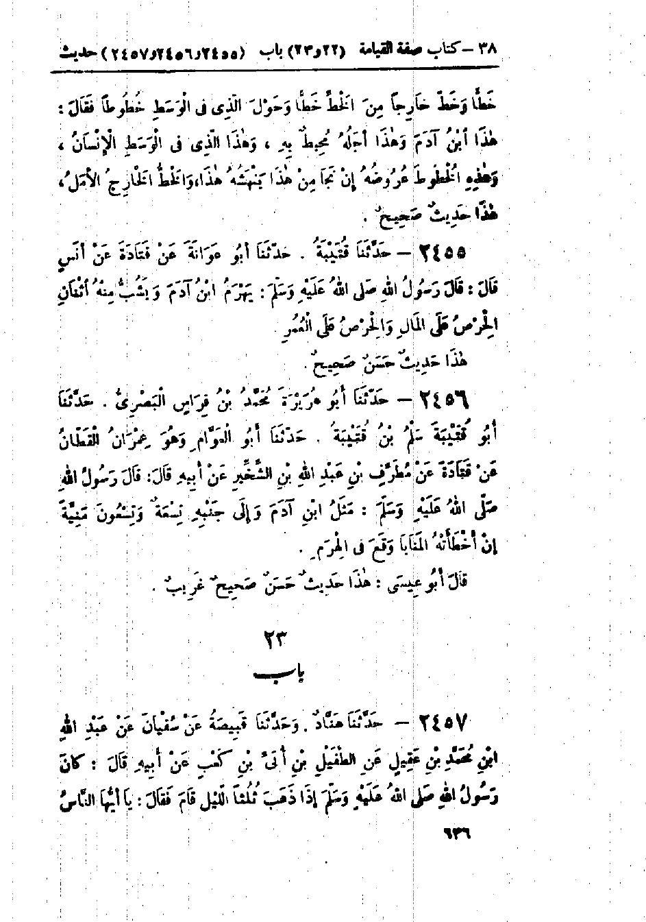 2456 - حَدَّثَنَا أَبُو هُرَيْرَةَ مُحَمَّدُ بْنُ فِرَاسٍ البَصْرِيُّ قَالَ: حَدَّثَنَا أَبُو قُتَيْبَةَ سَلْمُ بْنُ قُتَيْبَةَ قَالَ: حَدَّثَنَا أَبُو العَوَّامِ وَهُوَ عِمْرَانُ القَطَّانُ، عَنْ قَتَادَةَ، عَنْ مُطَرِّفِ بْنِ عَبْدِ اللَّهِ بْنِ الشِّخِّيرِ، عَنْ أَبِيهِ، قَالَ: قَالَ رَسُولُ اللَّهِ صَلَّى اللَّهُ عَلَيْهِ وَسَلَّمَ: «§مُثِّلَ ابْنُ آدَمَ وَإِلَى جَنْبِهِ تِسْعَةٌ وَتِسْعُونَ مَنِيَّةً إِنْ أَخْطَأَتْهُ المَنَايَا وَقَعَ فِي الهَرَمِ»: «هَذَا حَدِيثٌ حَسَنٌ غَرِيبٌ»