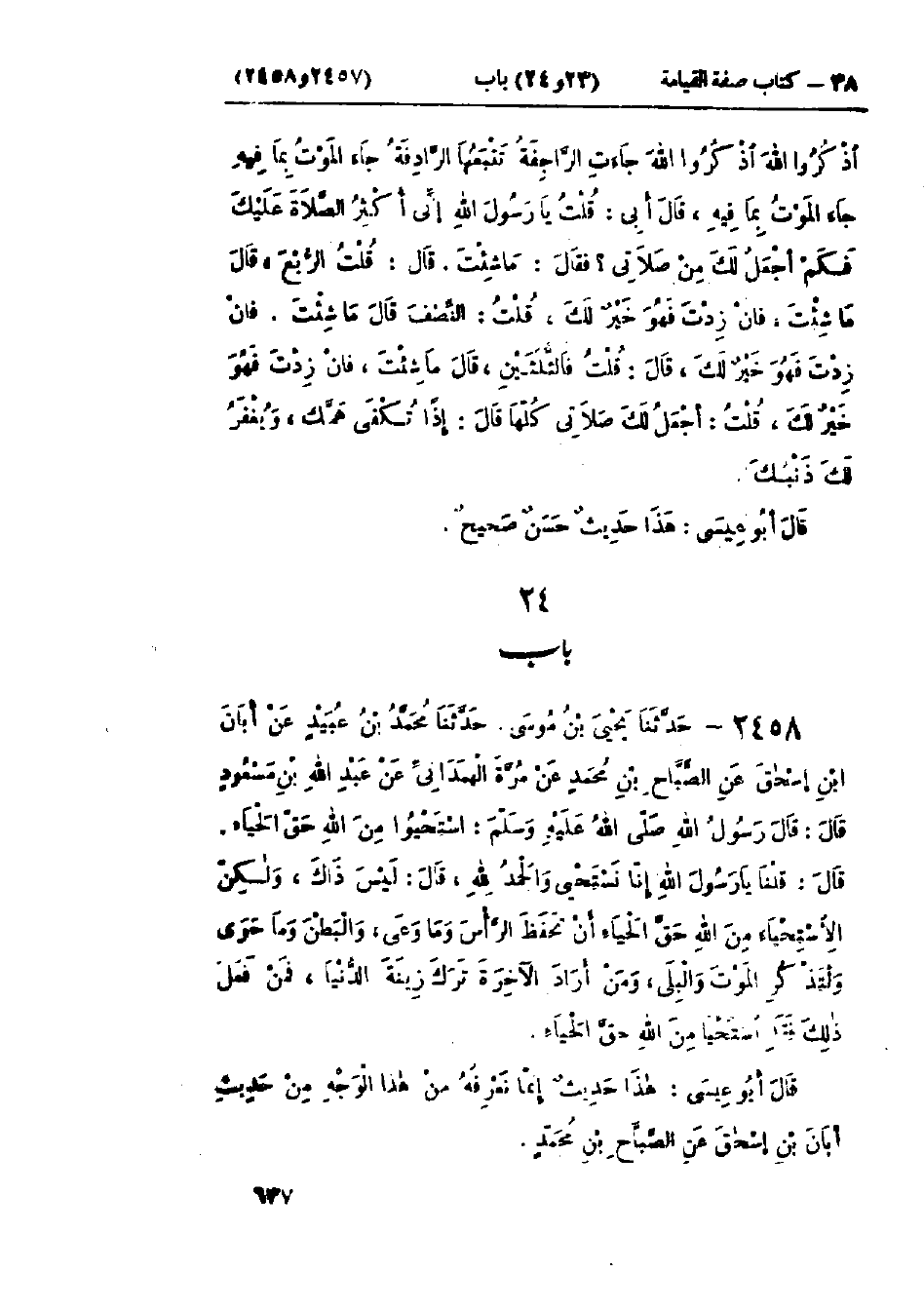 2458 - حَدَّثَنَا يَحْيَى بْنُ مُوسَى قَالَ: حَدَّثَنَا مُحَمَّدُ بْنُ عُبَيْدٍ، عَنْ أَبَانَ بْنِ إِسْحَاقَ، عَنْ الصَّبَّاحِ بْنِ مُحَمَّدٍ، عَنْ مُرَّةَ الهَمْدَانِيِّ، عَنْ عَبْدِ اللَّهِ بْنِ مَسْعُودٍ، قَالَ: قَالَ رَسُولُ اللَّهِ صَلَّى اللَّهُ عَلَيْهِ وَسَلَّمَ: «§اسْتَحْيُوا مِنَ اللَّهِ حَقَّ الحَيَاءِ». قَالَ: قُلْنَا: يَا رَسُولَ اللَّهِ إِنَّا نَسْتَحْيِي وَالحَمْدُ لِلَّهِ، قَالَ: «لَيْسَ ذَاكَ، وَلَكِنَّ الِاسْتِحْيَاءَ مِنَ اللَّهِ حَقَّ الحَيَاءِ أَنْ تَحْفَظَ الرَّأْسَ وَمَا وَعَى، وَالبَطْنَ وَمَا حَوَى، وَلْتَذْكُرِ المَوْتَ وَالبِلَى، وَمَنْ أَرَادَ الآخِرَةَ تَرَكَ زِينَةَ الدُّنْيَا، فَمَنْ فَعَلَ ذَلِكَ فَقَدْ اسْتَحْيَا مِنَ اللَّهِ حَقَّ الحَيَاءِ»: «هَذَا حَدِيثٌ غَرِيبٌ إِنَّمَا نَعْرِفُهُ مِنْ هَذَا الوَجْهِ مِنْ حَدِيثِ أَبَانَ بْنِ إِسْحَاقَ عَنِ الصَّبَّاحِ بْنِ مُحَمَّدٍ»