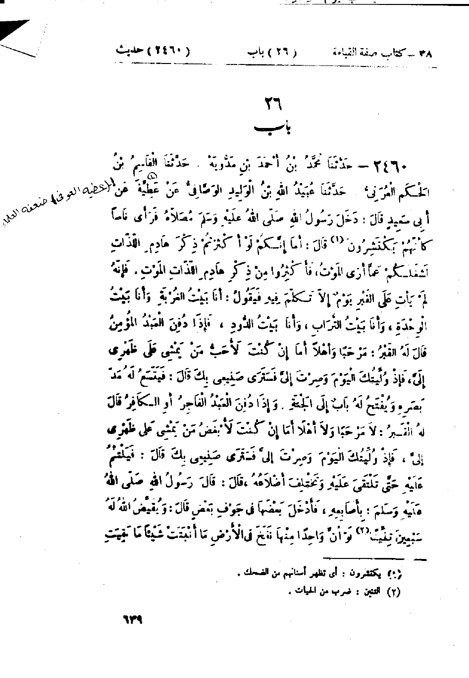 2460 - حَدَّثَنَا مُحَمَّدُ بْنُ أَحْمَدَ وَهُوَ ابْنُ مَدُّوَيْهِ قَالَ: حَدَّثَنَا القَاسِمُ بْنُ الحَكَمِ العُرَنِيُّ قَالَ: حَدَّثَنَا عُبَيْدُ اللَّهِ بْنُ الوَلِيدِ الوَصَّافِيُّ، عَنْ عَطِيَّةَ، عَنْ أَبِي سَعِيدٍ، قَالَ: دَخَلَ رَسُولُ اللَّهِ صَلَّى اللَّهُ عَلَيْهِ وَسَلَّمَ مُصَلَّاهُ فَرَأَى نَاسًا كَأَنَّهُمْ يَكْتَشِرُونَ قَالَ: " §أَمَا إِنَّكُمْ لَوْ أَكْثَرْتُمْ ذِكْرَ هَاذِمِ اللَّذَّاتِ لَشَغَلَكُمْ عَمَّا أَرَى، فَأَكْثِرُوا مِنْ ذِكْرِ هَاذِمِ اللَّذَّاتِ المَوْتِ، فَإِنَّهُ لَمْ يَأْتِ عَلَى القَبْرِ يَوْمٌ إِلَّا تَكَلَّمَ فِيهِ فَيَقُولُ: أَنَا بَيْتُ الغُرْبَةِ وَأَنَا بَيْتُ الوَحْدَةِ، وَأَنَا بَيْتُ التُّرَابِ، وَأَنَا بَيْتُ الدُّودِ، فَإِذَا دُفِنَ العَبْدُ المُؤْمِنُ قَالَ لَهُ القَبْرُ: مَرْحَبًا وَأَهْلًا أَمَا إِنْ كُنْتَ لَأَحَبَّ مَنْ يَمْشِي عَلَى ظَهْرِي إِلَيَّ، فَإِذْ وُلِّيتُكَ اليَوْمَ وَصِرْتَ إِلَيَّ فَسَتَرَى صَنِيعِيَ بِكَ " قَالَ: " فَيَتَّسِعُ لَهُ مَدَّ بَصَرِهِ وَيُفْتَحُ لَهُ بَابٌ إِلَى الجَنَّةِ. وَإِذَا دُفِنَ العَبْدُ الفَاجِرُ أَوِ الكَافِرُ قَالَ لَهُ القَبْرُ: لَا مَرْحَبًا وَلَا أَهْلًا أَمَا إِنْ كُنْتَ لَأَبْغَضَ مَنْ يَمْشِي عَلَى ظَهْرِي إِلَيَّ، فَإِذْ وُلِّيتُكَ اليَوْمَ وَصِرْتَ إِلَيَّ فَسَتَرَى صَنِيعِيَ بِكَ " قَالَ: «فَيَلْتَئِمُ عَلَيْهِ حَتَّى تَلْتَقِيَ عَلَيْهِ وَتَخْتَلِفَ أَضْلَاعُهُ»، قَالَ: قَالَ رَسُولُ اللَّهِ صَلَّى اللَّهُ عَلَيْهِ وَسَلَّمَ: بِأَصَابِعِهِ، فَأَدْخَلَ بَعْضَهَا فِي جَوْفِ بَعْضٍ قَالَ: «وَيُقَيِّضُ اللَّهُ لَهُ سَبْعِينَ تِنِّينًا لَوْ أَنْ وَاحِدًا مِنْهَا نَفَخَ فِي الأَرْضِ مَا أَنْبَتَتْ شَيْئًا مَا بَقِيَتِ -[640]- الدُّنْيَا فَيَنْهَشْنَهُ وَيَخْدِشْنَهُ حَتَّى يُفْضَى بِهِ إِلَى الْحِسَابِ»