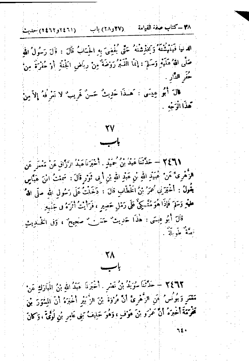 2461 - حَدَّثَنَا عَبْدُ بْنُ حُمَيْدٍ قَالَ: أَخْبَرَنَا عَبْدُ الرَّزَّاقِ، عَنْ مَعْمَرٍ، عَنْ الزُّهْرِيِّ، عَنْ عُبَيْدِ اللَّهِ بْنِ عَبْدِ اللَّهِ بْنِ أَبِي ثَوْرٍ، قَالَ: سَمِعْتُ ابْنَ عَبَّاسٍ، يَقُولُ: أَخْبَرَنِي عُمَرُ بْنُ الخَطَّابِ، قَالَ: «دَخَلْتُ عَلَى رَسُولِ اللَّهِ صَلَّى اللَّهُ عَلَيْهِ وَسَلَّمَ §فَإِذَا هُوَ مُتَّكِئٌ عَلَى رَمْلِ حَصِيرٍ فَرَأَيْتُ أَثَرَهُ فِي جَنْبِهِ»: «هَذَا حَدِيثٌ حَسَنٌ صَحِيحٌ غَرِيبٌ وَفِي الحَدِيثِ قِصَّةٌ طَوِيلَةٌ»