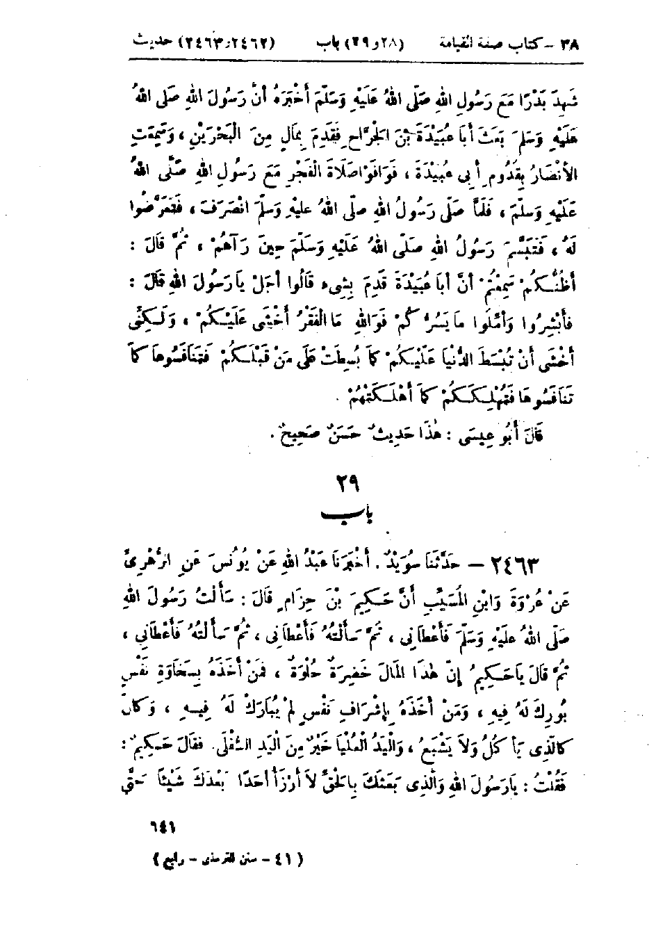 2463 - حَدَّثَنَا سُوَيْدٌ قَالَ: أَخْبَرَنَا عَبْدُ اللَّهِ، عَنْ يُونُسَ، عَنْ الزُّهْرِيِّ، عَنْ عُرْوَةَ، وَابْنِ المُسَيِّبِ، أَنَّ حَكِيمَ بْنَ حِزَامٍ، قَالَ: سَأَلْتُ رَسُولَ اللَّهِ صَلَّى اللَّهُ عَلَيْهِ وَسَلَّمَ فَأَعْطَانِي، ثُمَّ سَأَلْتُهُ فَأَعْطَانِي، ثُمَّ سَأَلْتُهُ فَأَعْطَانِي، ثُمَّ قَالَ: «يَا حَكِيمُ، إِنَّ §هَذَا المَالَ خَضِرَةٌ حُلْوَةٌ، فَمَنْ أَخَذَهُ بِسَخَاوَةِ نَفْسٍ بُورِكَ لَهُ فِيهِ، وَمَنْ أَخَذَهُ بِإِشْرَافِ نَفْسٍ لَمْ يُبَارَكْ لَهُ فِيهِ، وَكَانَ كَالَّذِي يَأْكُلُ وَلَا يَشْبَعُ، وَاليَدُ العُلْيَا خَيْرٌ مِنَ اليَدِ السُّفْلَى». فَقَالَ حَكِيمٌ: فَقُلْتُ: يَا رَسُولَ اللَّهِ وَالَّذِي بَعَثَكَ بِالحَقِّ لَا أَرْزَأُ أَحَدًا بَعْدَكَ شَيْئًا حَتَّى -[642]- أُفَارِقَ الدُّنْيَا «فَكَانَ أَبُو بَكْرٍ، يَدْعُو حَكِيمًا إِلَى العَطَاءِ فَيَأْبَى أَنْ يَقْبَلَهُ» ثُمَّ إِنَّ عُمَرَ، دَعَاهُ لِيُعْطِيَهُ فَأَبَى أَنْ يَقْبَلَ مِنْهُ شَيْئًا، فَقَالَ عُمَرُ: «إِنِّي أُشْهِدُكُمْ يَا مَعْشَرَ المُسْلِمِينَ عَلَى حَكِيمٍ أَنِّي أَعْرِضُ عَلَيْهِ حَقَّهُ مِنْ هَذَا الفَيْءِ فَيَأْبَى أَنْ يَأْخُذَهُ» فَلَمْ يَرْزَأْ حَكِيمٌ أَحَدًا مِنَ النَّاسِ شَيْئًا بَعْدَ رَسُولِ اللَّهِ صَلَّى اللَّهُ عَلَيْهِ وَسَلَّمَ حَتَّى تُوُفِّيَ «هَذَا حَدِيثٌ صَحِيحٌ»