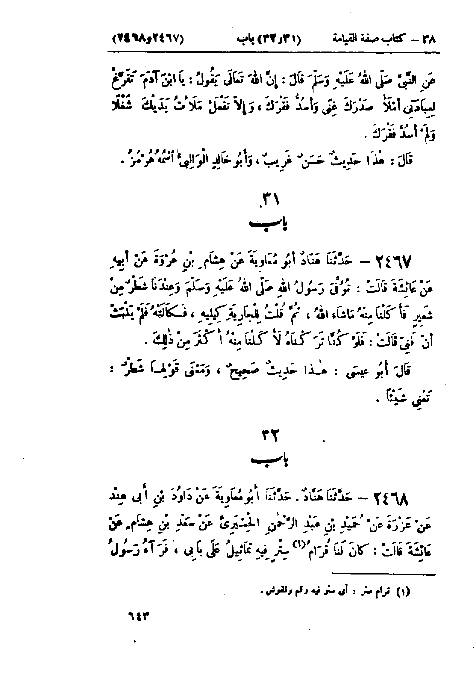 2468 - حَدَّثَنَا هَنَّادٌ قَالَ: حَدَّثَنَا أَبُو مُعَاوِيَةَ، عَنْ دَاوُدَ بْنِ أَبِي هِنْدٍ، عَنْ عَزْرَةَ، عَنْ حُمَيْدِ بْنِ عَبْدِ الرَّحْمَنِ الحِمْيَرِيِّ، عَنْ سَعْدِ بْنِ هِشَامٍ، عَنْ عَائِشَةَ، قَالَتْ: كَانَ لَنَا قِرَامُ سِتْرٍ فِيهِ تَمَاثِيلُ عَلَى بَابِي، فَرَآهُ رَسُولُ -[644]- اللَّهِ صَلَّى اللَّهُ عَلَيْهِ وَسَلَّمَ فَقَالَ: «§انْزَعِيهِ فَإِنَّهُ يُذَكِّرُنِي الدُّنْيَا» قَالَتْ: «وَكَانَ لَنَا سَمَلُ قَطِيفَةٍ تَقُولُ عَلَمُهَا مِنْ حَرِيرٍ كُنَّا نَلْبَسُهَا»: «هَذَا حَدِيثٌ حَسَنٌ مِنْ هَذَا الوَجْهِ»