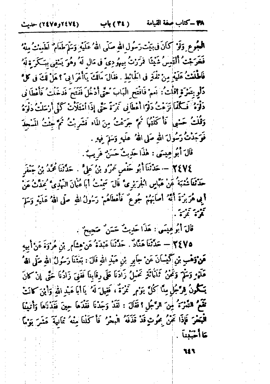 2474 - حَدَّثَنَا أَبُو حَفْصٍ عَمْرُو بْنُ عَلِيٍّ قَالَ: حَدَّثَنَا مُحَمَّدُ بْنُ جَعْفَرٍ قَالَ: حَدَّثَنَا شُعْبَةُ، عَنْ عَبَّاسٍ الجُرَيْرِيِّ، قَالَ: سَمِعْتُ أَبَا عُثْمَانَ النَّهْدِيَّ، يُحَدِّثُ عَنْ أَبِي هُرَيْرَةَ، «أَنَّهُمْ §أَصَابَهُمْ جُوعٌ فَأَعْطَاهُمْ رَسُولُ اللَّهِ صَلَّى اللَّهُ عَلَيْهِ وَسَلَّمَ تَمْرَةً تَمْرَةً»: «هَذَا حَدِيثٌ صَحِيحٌ»