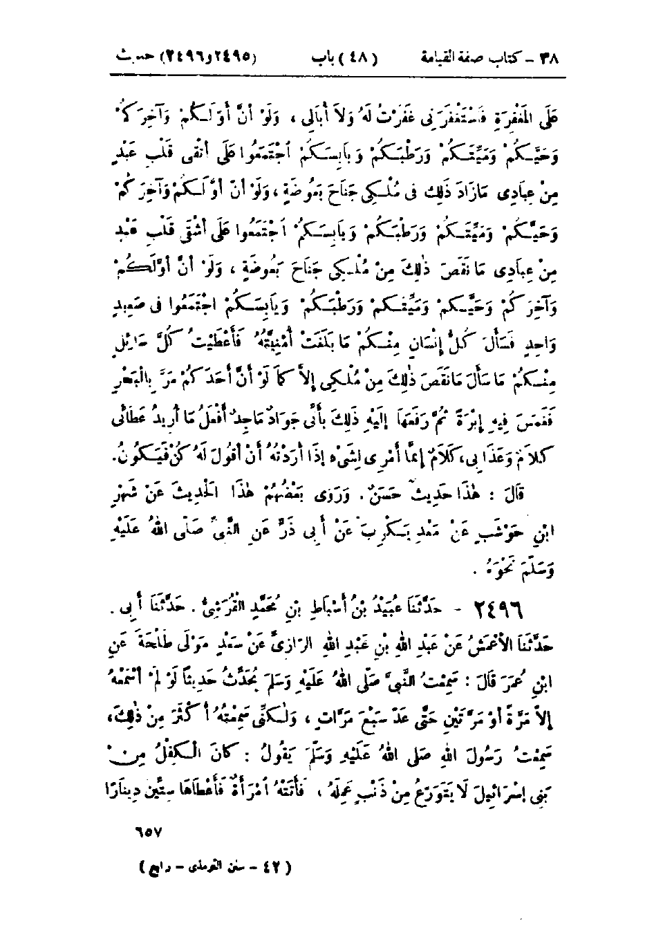 2496 - حَدَّثَنَا عُبَيْدُ بْنُ أَسْبَاطِ بْنِ مُحَمَّدٍ القُرَشِيُّ قَالَ: حَدَّثَنَا أَبِي قَالَ: حَدَّثَنَا الأَعْمَشُ، عَنْ عَبْدِ اللَّهِ بْنِ عَبْدِ اللَّهِ الرَّازِيِّ، عَنْ سَعْدٍ، مَوْلَى طَلْحَةَ، عَنْ ابْنِ عُمَرَ، قَالَ: سَمِعْتُ النَّبِيَّ صَلَّى اللَّهُ عَلَيْهِ وَسَلَّمَ يُحَدِّثُ حَدِيثًا لَوْ لَمْ أَسْمَعْهُ إِلَّا مَرَّةً أَوْ مَرَّتَيْنِ حَتَّى عَدَّ سَبْعَ مَرَّاتٍ، وَلَكِنِّي سَمِعْتُهُ أَكَثَرَ مِنْ ذَلِكَ، سَمِعْتُ رَسُولَ اللَّهِ صَلَّى اللَّهُ عَلَيْهِ وَسَلَّمَ يَقُولُ: " §كَانَ الكِفْلُ مِنْ بني إسرائيل لَا يَتَوَرَّعُ مِنْ ذَنْبٍ عَمِلَهُ، فَأَتَتْهُ امْرَأَةٌ فَأَعْطَاهَا سِتِّينَ دِينَارًا -[658]- عَلَى أَنْ يَطَأَهَا، فَلَمَّا قَعَدَ مِنْهَا مَقْعَدَ الرَّجُلِ مِنْ امْرَأَتِهِ أَرْعَدَتْ وَبَكَتْ، فَقَالَ: مَا يُبْكِيكِ أَأَكْرَهْتُكِ؟ قَالَتْ: لَا وَلَكِنَّهُ عَمَلٌ مَا عَمِلْتُهُ قَطُّ، وَمَا حَمَلَنِي عَلَيْهِ إِلَّا الحَاجَةُ، فَقَالَ: تَفْعَلِينَ أَنْتِ هَذَا وَمَا فَعَلْتِهِ؟ اذْهَبِي فَهِيَ لَكِ، وَقَالَ: لَا وَاللَّهِ لَا أَعْصِي اللَّهَ بَعْدَهَا أَبَدًا، فَمَاتَ مِنْ لَيْلَتِهِ فَأَصْبَحَ مَكْتُوبًا عَلَى بَابِهِ، إِنَّ اللَّهَ قَدْ غَفَرَ لِلْكِفْلِ ": «هَذَا حَدِيثٌ حَسَنٌ» وَقَدْ رَوَاهُ شَيْبَانُ وَغَيْرُ وَاحِدٍ عَنِ الأَعْمَشِ، نَحْوَ هَذَا وَرَفَعُوهُ، «وَرَوَى بَعْضُهُمْ عَنِ الأعْمَشِ فَلَمْ يَرْفَعْهُ» وَرَوَى أَبُو بَكْرِ بْنُ عَيَّاشٍ، هَذَا الحَدِيثَ عَنِ الأَعْمَشِ، " فَأَخْطَأَ فِيهِ، وَقَالَ: عَنْ عَبْدِ اللَّهِ بْنِ عَبْدِ اللَّهِ، عَنْ سَعِيدِ بْنِ جُبَيْرٍ، عَنْ ابْنِ عُمَرَ وَهُوَ غَيْرُ مَحْفُوظٍ «وَعَبْدُ اللَّهِ بْنُ عَبْدِ اللَّهِ الرَّازِيُّ، هُوَ كُوفِيٌّ وَكَانَتْ جَدَّتُهُ سُرِّيَّةً لِعَلِيِّ بْنِ أَبِي طَالِبٍ. وَرَوَى عَنْ عَبْدِ اللَّهِ بْنِ عَبْدِ اللَّهِ الرَّازِيِّ، عُبَيْدَةُ الضَّبِّيُّ، وَالحَجَّاجُ بْنُ أَرْطَاةَ، وَغَيْرُ وَاحِدٍ مِنْ كِبَارِ أَهْلِ العِلْمِ»