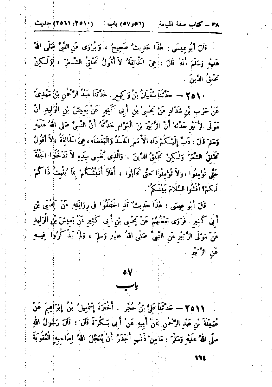 2510 - حَدَّثَنَا سُفْيَانُ بْنُ وَكِيعٍ قَالَ: حَدَّثَنَا عَبْدُ الرَّحْمَنِ بْنُ مَهْدِيٍّ، عَنْ حَرْبِ بْنِ شَدَّادٍ، عَنْ يَحْيَى بْنِ أَبِي كَثِيرٍ، عَنْ يَعِيشَ بْنِ الوَلِيدِ، أَنَّ مَوْلًى لِلزُّبَيْرِ، حَدَّثَهُ أَنَّ الزُّبَيْرَ بْنَ العَوَّامِ، حَدَّثَهُ أَنَّ النَّبِيَّ صَلَّى اللَّهُ عَلَيْهِ وَسَلَّمَ قَالَ: " §دَبَّ إِلَيْكُمْ دَاءُ الأُمَمِ قَبْلَكُمْ: الحَسَدُ وَالبَغْضَاءُ، هِيَ الحَالِقَةُ، لَا أَقُولُ تَحْلِقُ الشَّعَرَ وَلَكِنْ تَحْلِقُ الدِّينَ، وَالَّذِي نَفْسِي بِيَدِهِ لَا تَدْخُلُوا الجَنَّةَ حَتَّى تُؤْمِنُوا، وَلَا تُؤْمِنُوا حَتَّى تَحَابُّوا، أَفَلَا أُنَبِّئُكُمْ بِمَا يُثَبِّتُ ذَلِكَ لَكُمْ؟ أَفْشُوا السَّلَامَ بَيْنَكُمْ ": «هَذَا حَدِيثٌ قَدْ اخْتَلَفُوا فِي رِوَايَتِهِ عَنْ يَحْيَى بْنِ أَبِي كَثِيرٍ». فَرَوَى بَعْضُهُمْ عَنْ يَحْيَى بْنِ أَبِي كَثِيرٍ، عَنْ يَعِيشَ بْنِ الوَلِيدِ، عَنْ مَوْلَى الزُّبَيْرِ، عَنِ النَّبِيِّ صَلَّى اللَّهُ عَلَيْهِ وَسَلَّمَ، «وَلَمْ يَذْكُرُوا فِيهِ عَنِ الزُّبَيْرِ»