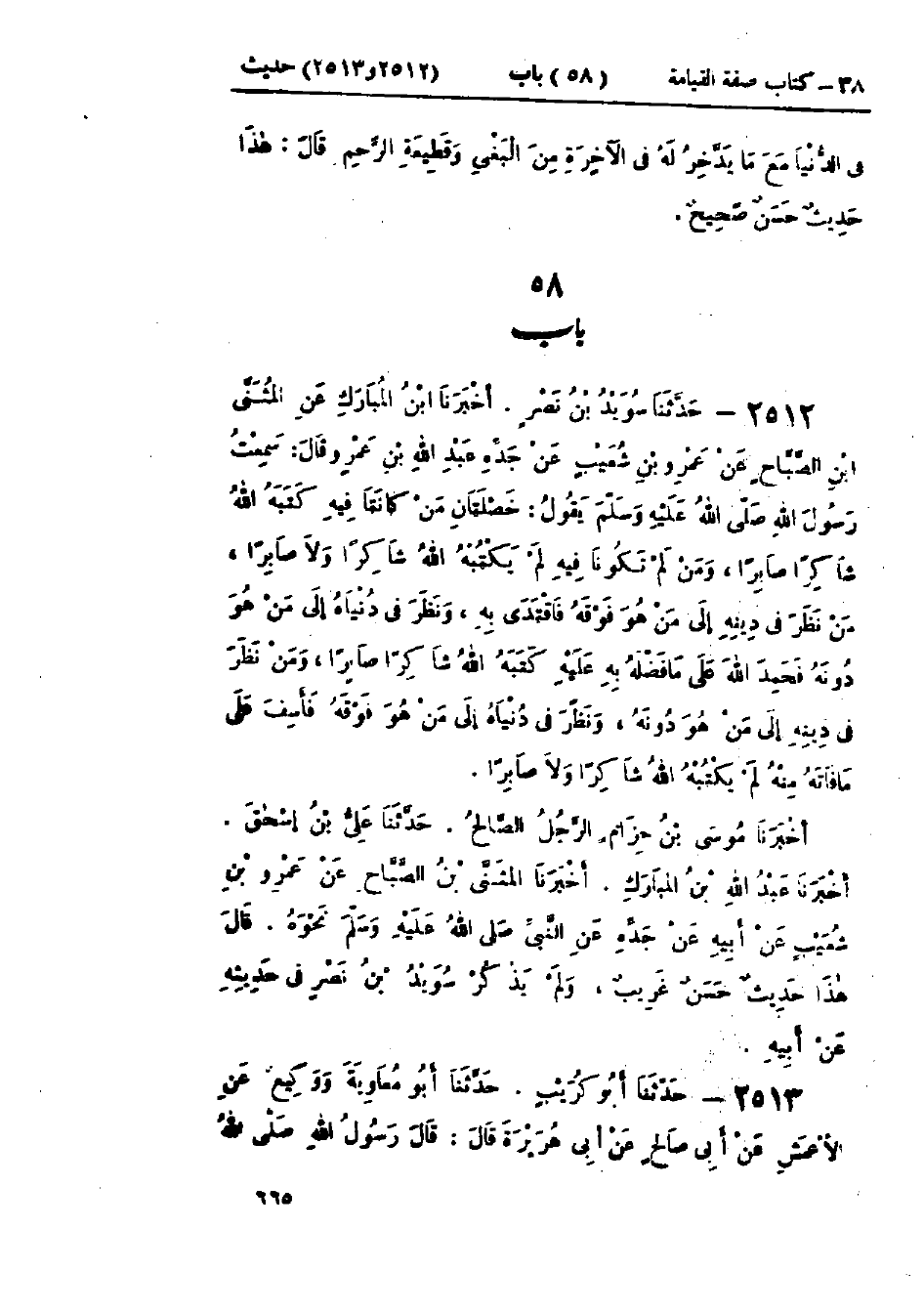 2512 - حَدَّثَنَا سُوَيْدُ بْنُ نَصْرٍ قَالَ: أَخْبَرَنَا ابْنُ المُبَارَكِ، عَنْ المُثَنَّى بْنِ الصَّبَّاحِ، عَنْ عَمْرِو بْنِ شُعَيْبٍ، عَنْ جَدِّهِ عَبْدِ اللَّهِ بْنِ عَمْرٍو، قَالَ: سَمِعْتُ رَسُولَ اللَّهِ صَلَّى اللَّهُ عَلَيْهِ وَسَلَّمَ يَقُولُ: «§خَصْلَتَانِ مَنْ كَانَتَا فِيهِ كَتَبَهُ اللَّهُ شَاكِرًا صَابِرًا، وَمَنْ لَمْ تَكُونَا فِيهِ لَمْ يَكْتُبْهُ اللَّهُ شَاكِرًا وَلَا صَابِرًا، مَنْ نَظَرَ فِي دِينِهِ إِلَى مَنْ هُوَ فَوْقَهُ فَاقْتَدَى بِهِ، وَنَظَرَ فِي دُنْيَاهُ إِلَى مَنْ هُوَ دُونَهُ فَحَمِدَ اللَّهَ عَلَى مَا فَضَّلَهُ بِهِ عَلَيْهِ كَتَبَهُ اللَّهُ شَاكِرًا وَصَابِرًا، وَمَنْ نَظَرَ فِي دِينِهِ إِلَى مَنْ هُوَ دُونَهُ، وَنَظَرَ فِي دُنْيَاهُ إِلَى مَنْ هُوَ فَوْقَهُ فَأَسِفَ عَلَى مَا فَاتَهُ مِنْهُ لَمْ يَكْتُبْهُ اللَّهُ شَاكِرًا وَلَا صَابِرًا». حَدَّثَنَا مُوسَى بْنُ حِزَامٍ، الرَّجُلُ الصَّالِحُ قَالَ: حَدَّثَنَا عَلِيُّ بْنُ إِسْحَاقَ قَالَ: أَخْبَرَنَا عَبْدُ اللَّهِ بْنُ المُبَارَكِ قَالَ: أَخْبَرَنَا المُثَنَّى بْنُ الصَّبَّاحِ، عَنْ عَمْرِو بْنِ شُعَيْبٍ، عَنْ أَبِيهِ، عَنْ جَدِّهِ، عَنِ النَّبِيِّ صَلَّى اللَّهُ عَلَيْهِ وَسَلَّمَ نَحْوَهُ، «هَذَا حَدِيثٌ غَرِيبٌ وَلَمْ يَذْكُرْ سُوَيْدُ بْنُ نَصْرٍ فِي حَدِيثِهِ عَنْ أَبِيهِ»
