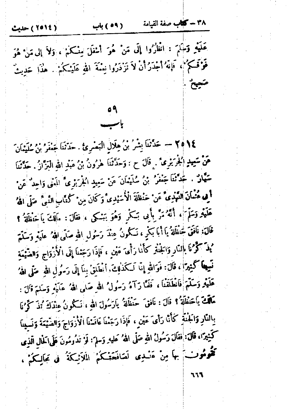 2514 - حَدَّثَنَا بِشْرُ بْنُ هِلَالٍ البَصْرِيُّ قَالَ: حَدَّثَنَا جَعْفَرُ بْنُ سُلَيْمَانَ، عَنْ سَعِيدٍ الجُرَيْرِيِّ، ح وحَدَّثَنَا هَارُونُ بْنُ عَبْدِ اللَّهِ البَزَّازُ قَالَ: حَدَّثَنَا سَيَّارٌ قَالَ: حَدَّثَنَا جَعْفَرُ بْنُ سُلَيْمَانَ، عَنْ سَعِيدٍ الجُرَيْرِيِّ، وَالْمَعْنَى وَاحِدٌ عَنْ أَبِي عُثْمَانَ النَّهْدِيِّ، عَنْ حَنْظَلَةَ الأُسَيِّدِيِّ، - وَكَانَ مِنْ كُتَّابِ النَّبِيِّ صَلَّى اللَّهُ عَلَيْهِ وَسَلَّمَ - أَنَّهُ مَرَّ بِأَبِي بَكْرٍ وَهُوَ يَبْكِي، فَقَالَ: مَا لَكَ يَا حَنْظَلَةُ؟ قَالَ: نَافَقَ حَنْظَلَةُ يَا أَبَا بَكْرٍ، نَكُونُ عِنْدَ رَسُولِ اللَّهِ صَلَّى اللَّهُ عَلَيْهِ وَسَلَّمَ يُذَكِّرُنَا بِالنَّارِ وَالجَنَّةِ كَأَنَّا رَأْيَ عَيْنٍ، فَإِذَا رَجَعْنَا عَافَسْنَا الْأَزْوَاجِ وَالضَّيْعَةِ وَنَسِينَا كَثِيرًا، قَالَ: فَوَاللَّهِ إِنَّا لَكَذَلِكَ، انْطَلِقْ بِنَا إِلَى رَسُولِ اللَّهِ صَلَّى اللَّهُ عَلَيْهِ وَسَلَّمَ فَانْطَلَقْنَا، فَلَمَّا رَآهُ رَسُولُ اللَّهِ صَلَّى اللَّهُ عَلَيْهِ وَسَلَّمَ قَالَ: «مَا لَكَ يَا حَنْظَلَةُ»؟ قَالَ: نَافَقَ حَنْظَلَةُ يَا رَسُولَ اللَّهِ، نَكُونُ عِنْدَكَ تُذَكِّرُنَا بِالنَّارِ وَالجَنَّةِ كَأَنَّا رَأْيَ عَيْنٍ، فَإِذَا رَجَعْنَا عَافَسْنَا الأَزْوَاجَ وَالضَّيْعَةَ وَنَسِينَا كَثِيرًا، قَالَ: فَقَالَ رَسُولُ اللَّهِ صَلَّى اللَّهُ عَلَيْهِ وَسَلَّمَ: «§لَوْ تَدُومُونَ عَلَى الْحَالِ الَّتِي تَقُومُونَ بِهَا مِنْ عِنْدِي لَصَافَحَتْكُمُ المَلَائِكَةُ فِي مَجَالِسِكُمْ، -[667]- وَفِي طُرُقِكُمْ، وَعَلَى فُرُشِكُمْ، وَلَكِنْ يَا حَنْظَلَةُ سَاعَةً وَسَاعَةً». هَذَا حَدِيثٌ حَسَنٌ غَرِيبٌ