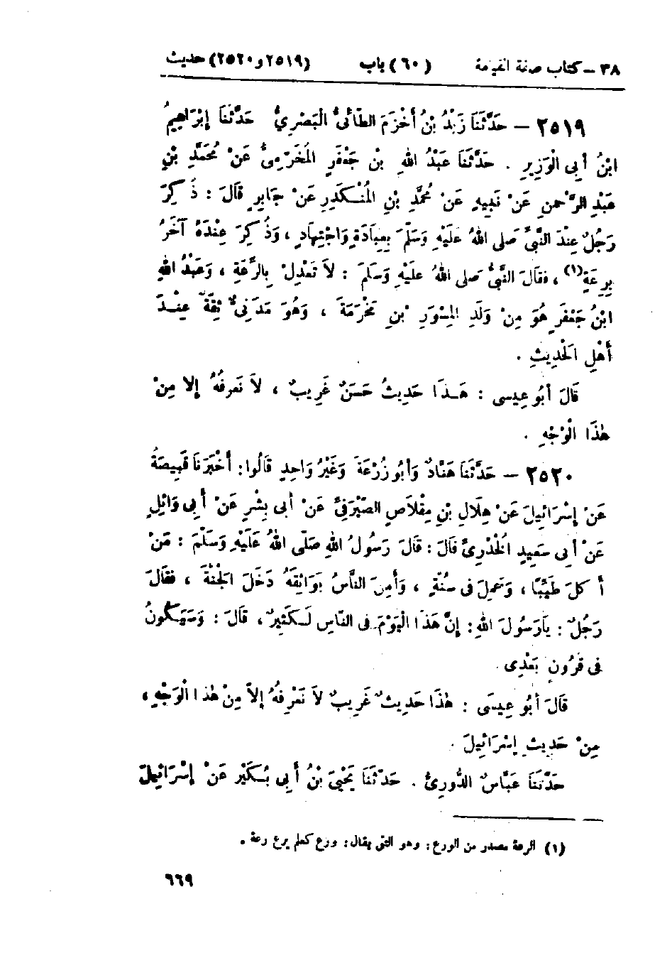 2519 - حَدَّثَنَا زَيْدُ بْنُ أَخْزَمَ الطَّائِيُّ البَصْرِيُّ قَالَ: حَدَّثَنَا إِبْرَاهِيمُ بْنُ أَبِي الوَزِيرِ قَالَ: حَدَّثَنَا عَبْدُ اللَّهِ بْنُ جَعْفَرٍ المَخْرَمِيُّ، عَنْ مُحَمَّدِ بْنِ عَبْدِ الرَّحْمَنِ بْنِ نُبَيْهٍ، عَنْ مُحَمَّدِ بْنِ المُنْكَدِرِ، عَنْ جَابِرٍ، قَالَ: ذُكِرَ رَجُلٌ عِنْدَ النَّبِيِّ صَلَّى اللَّهُ عَلَيْهِ وَسَلَّمَ بِعِبَادَةٍ وَاجْتِهَادٍ، وَذُكِرَ عِنْدَهُ آخَرُ بِرِعَةٍ، فَقَالَ النَّبِيُّ صَلَّى اللَّهُ عَلَيْهِ وَسَلَّمَ: «§لَا يُعْدَلُ بِالرِّعَةِ» وَعَبْدُ اللَّهِ بْنُ جَعْفَرٍ هُوَ مِنْ وَلَدِ المِسْوَرِ بْنِ مَخْرَمَةَ، وَهُوَ مَدَنِيٌّ ثِقَةٌ عِنْدَ أَهْلِ الحَدِيثِ ": «هَذَا حَدِيثٌ غَرِيبٌ لَا نَعْرِفُهُ إِلَّا مِنْ هَذَا الوَجْهِ»