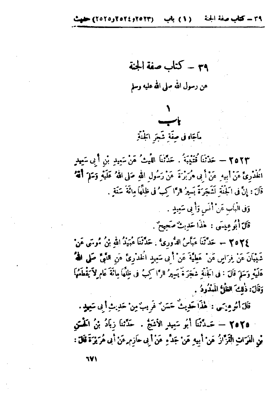 2523 - حَدَّثَنَا قُتَيْبَةُ قَالَ: حَدَّثَنَا اللَّيْثُ، عَنْ سَعِيدِ بْنِ أَبِي سَعِيدٍ، عَنْ أَبِيهِ، عَنْ أَبِي هُرَيْرَةَ، عَنْ رَسُولِ اللَّهِ صَلَّى اللَّهُ عَلَيْهِ وَسَلَّمَ أَنَّهُ قَالَ: «إِنَّ §فِي الجَنَّةِ لَشَجَرَةً يَسِيرُ الرَّاكِبُ فِي ظِلِّهَا مِائَةَ عَامٍ» وَفِي البَابِ عَنْ أَنَسٍ، وَأَبِي سَعِيدٍ: «هَذَا حَدِيثٌ صَحِيحٌ»